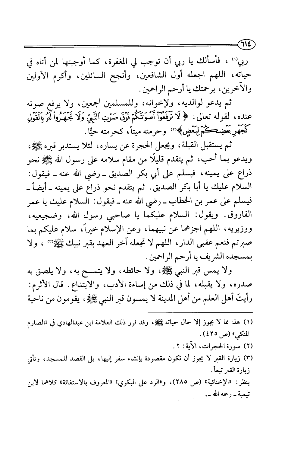 ثم يدعو لوالديه، ولإخوانه، وللمسلمين أجمعين، ولا يرفع صوته عنده، لقوله تعالى: {لَا تَرْفَعُوا أَصْوَاتَكُمْ فَوْقَ صَوْتِ النَّبِيِّ وَلَا تَجْهَرُوا لَهُ بِالْقَوْلِ كَجَهْرِ بَعْضِكُمْ لِبَعْضٍ} (¬2) وحرمته ميتًا، كحرمته حيًّا.