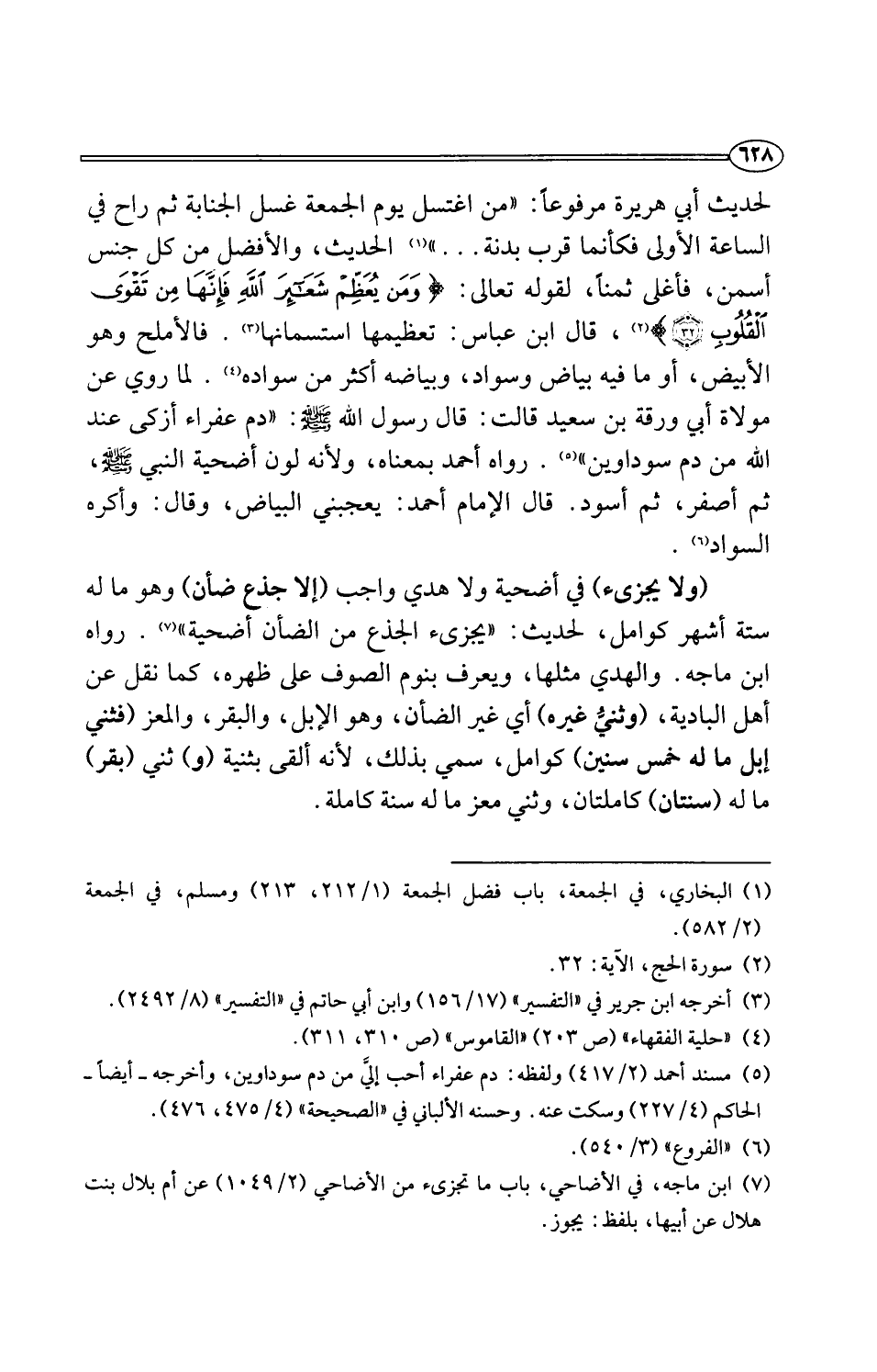 (¬5) مسند أحمد (2/ 417) ولفظه: دم عفراء أحب إليَّ من دم سوداوين، وأخرجه -أيضًا- الحاكم (4/ 227) وسكت عنه. وحسنه الألباني في "الصحيحة" (4/ 475، 476).