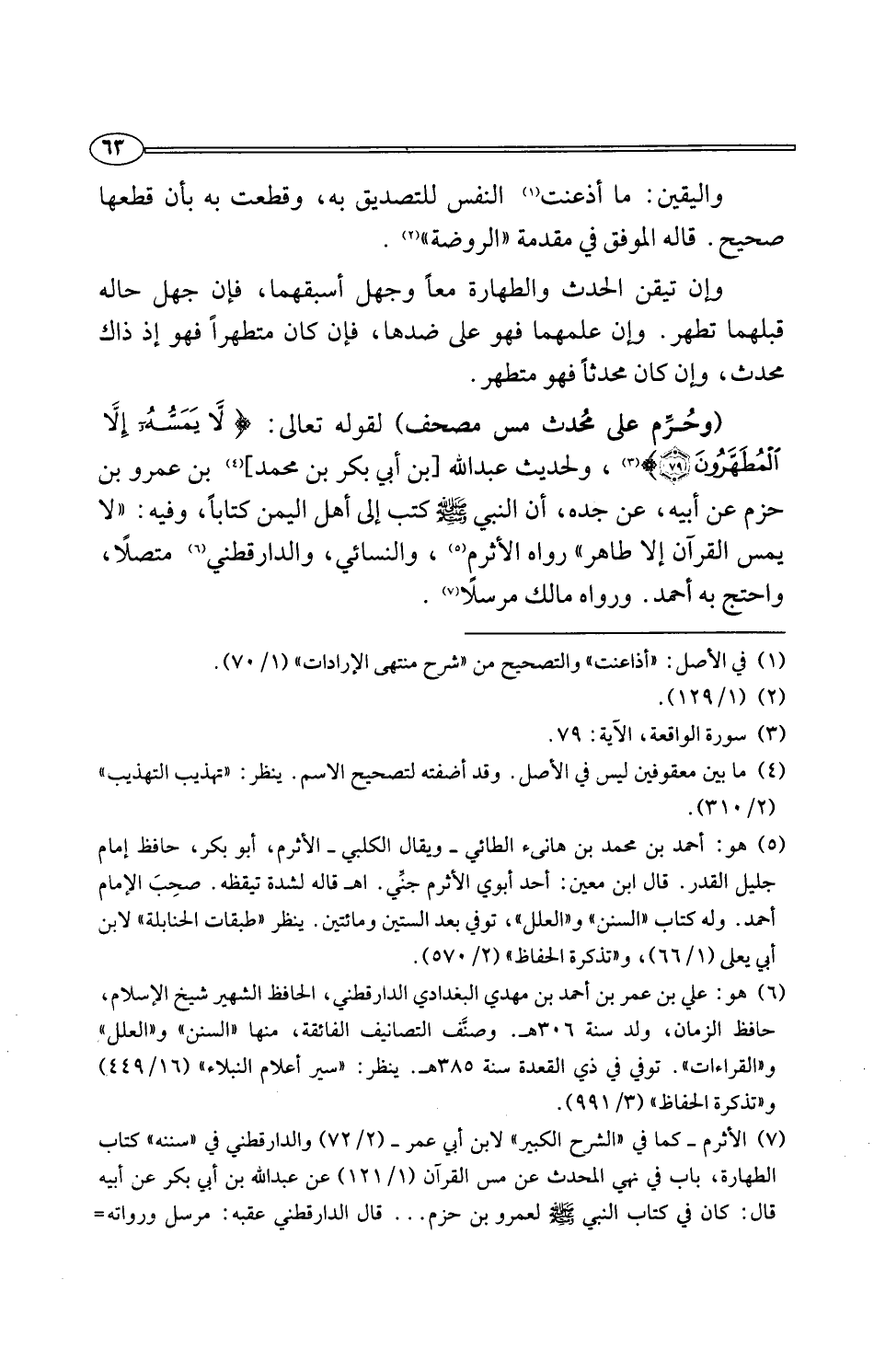 (وحُرِّم على مُحدث مس مصحف) لقوله تعالى: {لَا يَمَسُّهُ إِلَّا الْمُطَهَّرُونَ (79)} (¬3)، ولحديث عبد اللَّه [بن أبي بكر بن محمد] (¬4) بن عمرو بن حزم عن أبيه، عن جده، أن النبي -صلى اللَّه عليه وسلم- كتب إلى أهل اليمن كتابًا، وفيه: "لا يمس القرآن إلا طاهر" رواه الأثرم (¬5)، والنسائي، والدارقطني (¬6) متصلًا، واحتج به أحمد. ورواه مالك مرسلًا (¬7).