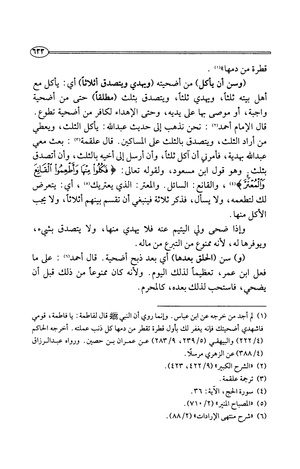 (وسن أن يأكل) من أضحيته (ويهدي ويتصدق أثلاثًا) أي: يأكل مع أهل بيته ثلثًا، ويهدي ثلثًا، ويتصدق بثلث (مطلقًا) حتى من أضحية واجبة، أو موصى بها على يديه، وحتى الإهداء لكافر من أضحية تطوع. قال الإمام أحمد (¬2): نحن نذهب إلى حديث عبد اللَّه: يأكل الثلث، ويعطي من أراد الثلث، ويتصدق بالثلث على المساكين. قال علقمة (¬3): بعث معي عبد اللَّه بهدية، فأمرني أن آكل ثلثًا، وأن أرسل إلى أخيه بالثلث، وأن أتصدق بثلث. وهو قول ابن مسعود، ولقوله تعالى: {فَكُلُوا مِنْهَا وَأَطْعِمُوا الْقَانِعَ وَالْمُعْتَرَّ} (¬4)، والقانع: السائل. والمعتر: الذي يعتريك (¬5)، أي: يتعرض لك لتطعمه، ولا يسأل، فذكر ثلاثة فينبغي أن تقسم بينهم أثلاثًا، ولا يجب الأكل منها.