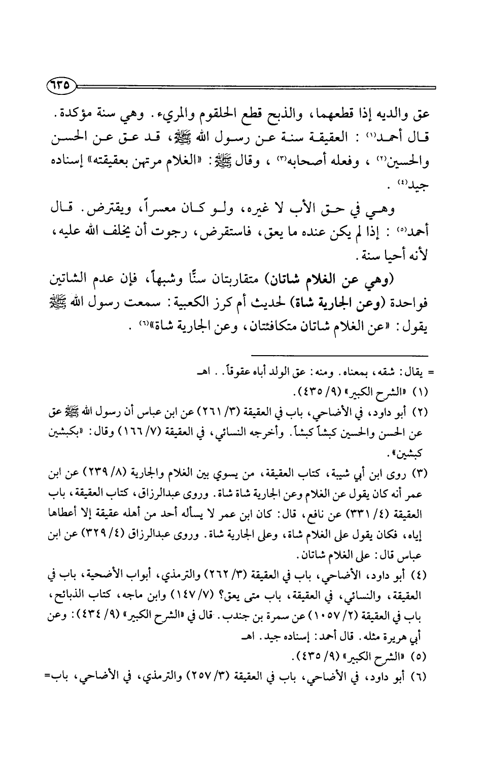 عق والديه إذا قطعهما، والذبح قطع الحلقوم والمريء. وهي سنة مؤكدة. قال أحمد (¬1): العقيقة سنة عن رسول اللَّه -صلى اللَّه عليه وسلم-، قد عق عن الحسن والحسين (¬2)، وفعله أصحابه (¬3)، وقال -صلى اللَّه عليه وسلم-: "الغلام مرتهن بعقيقته" إسناده جيد (¬4).