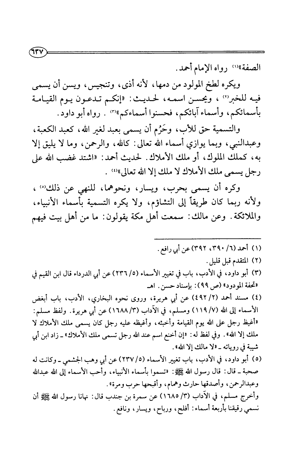(¬5) أبو داود، في الأدب، باب تغيير الأسماء (5/ 237) عن أبي وهب الجشمي -كانت له صحبة- قال: قال رسول اللَّه -صلى اللَّه عليه وسلم-: "تسموا بأسماء الأنبياء، وأحب الأسماء إلى اللَّه عبد اللَّه وعبد الرحمن، وأصدقها حارث وهمام، وأقبحها حرب ومرة".