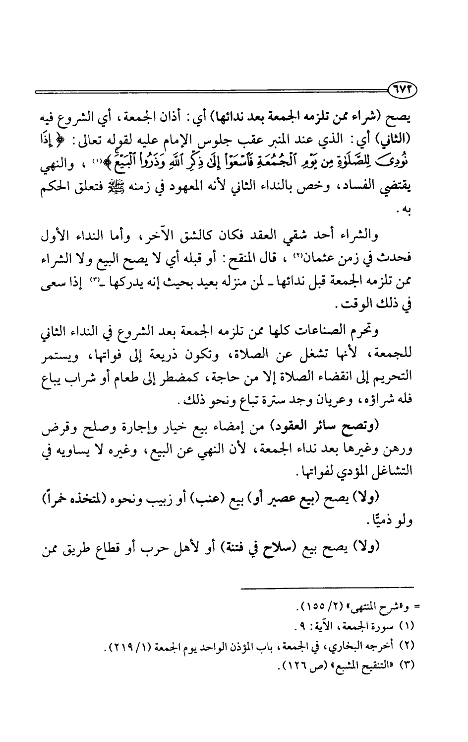 يصح (شراء ممن تلزمه الجمعة بعد ندائها) أي: أذان الجمعة، أي الشروع فيه (الثاني) أي: الذي عند المنبر عقب جلوس الإمام عليه لقوله تعالى: {إِذَا نُودِيَ لِلصَّلَاةِ مِنْ يَوْمِ الْجُمُعَةِ فَاسْعَوْا إِلَى ذِكْرِ اللَّهِ وَذَرُوا الْبَيْعَ} (¬1)، والنهي يقتضي الفساد، وخص بالنداء الثاني لأنه المعهود في زمنه -صلى اللَّه عليه وسلم- فتعلق الحكم به.