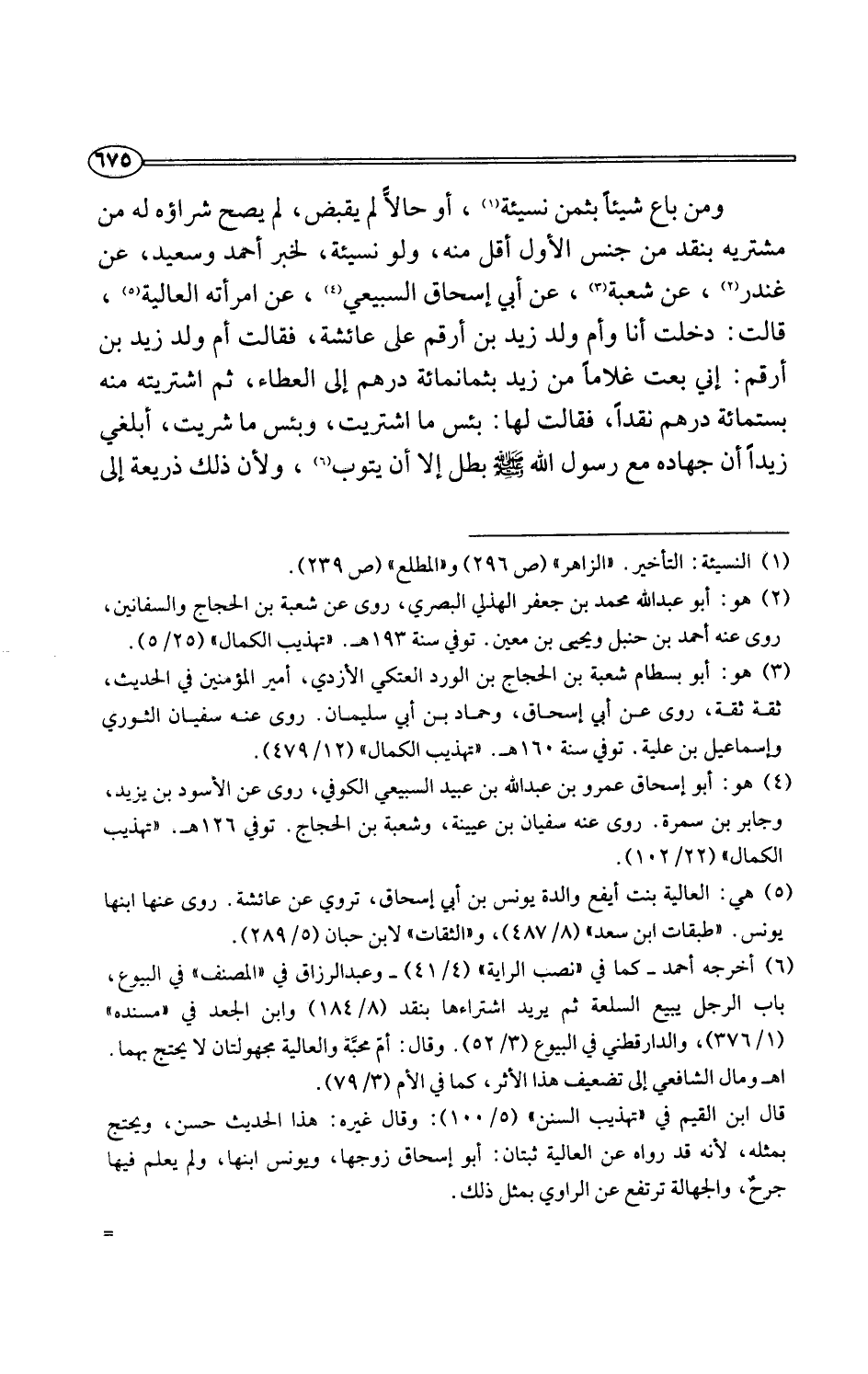 (¬6) أخرجه أحمد -كما في "نصب الراية" (4/ 41) - وعبد الرزاق في "المصنف" في البيوع، باب الرجل يبيع السلعة ثم يريد اشتراءها بنقد (8/ 184) وابن الجعد في "مسنده" (1/ 376)، والدارقطني في البيوع (3/ 52). وقال: أمّ محبَّة والعالية مجهولتان لا يحتج بهما. اهـ ومال الشافعي إلى تضعيف هذا الأثر، كما في الأم (3/ 79).