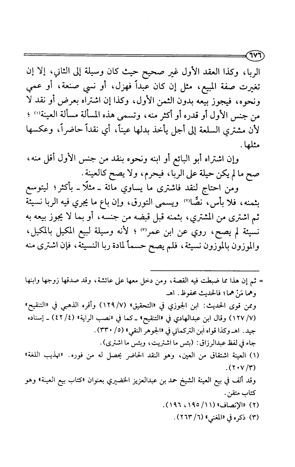 الربا، وكذا العقد الأول غير صحيح حيث كان وسيلة إلى الثاني، إلا إن تغيرت صفة المبيع، مثل إن كان عبدًا فهزل، أو نسي صنعة، أو عمي ونحوه، فيجوز بيعه بدون الثمن الأول، وكذا إن اشتراه بعرض أو نقد لا من جنس الأول أو قدره أو أكثر منه، وتسمى هذه المسألة مسألة العينة (¬1)؛ لأن مشتري السلعة إلى أجل يأخذ بدلها عينًا؛ أي نقدًا حاضرًا، وعكسها مثلها.