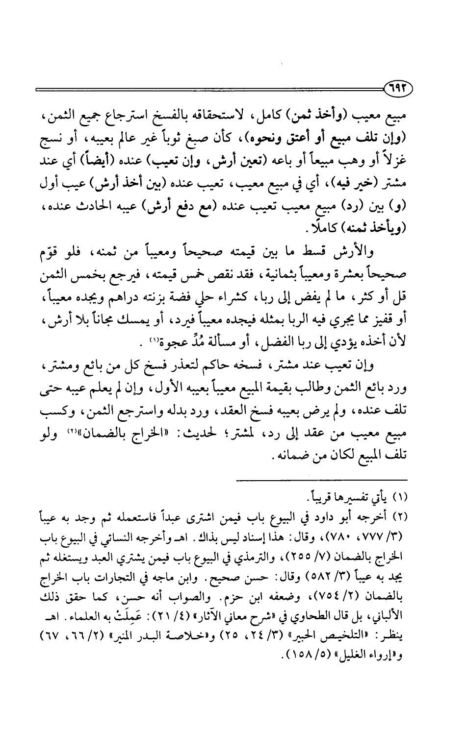 (¬2) أخرجه أبو داود في البيوع باب فيمن اشترى عبدًا فاستعمله ثم وجد به عيبًا (3/ 777، 780)، وقال: هذا إسناد ليس بذاك. اهـ وأخرجه النسائي في البيوع باب الخراج بالضمان (7/ 255)، والترمذي في البيوع باب فيمن يشتري العبد ويستغله ثم يجد به عيبًا (3/ 582) وقال: حسن صحيح. وابن ماجه في التجارات باب الخراج بالضمان (2/ 754)، وضعفه ابن حزم. والصواب أنه حسن، كما حقق ذلك الألباني، بل قال الطحاوي في "شرح معاني الآثار" (4/ 21): عَمِلَتْ به العلماء. اهـ ينظر: "التلخيص الحبير" (3/ 24، 25) و"خلاصة البدر المنير" (2/ 66، 67) و"إرواء الغليل" (5/ 158).