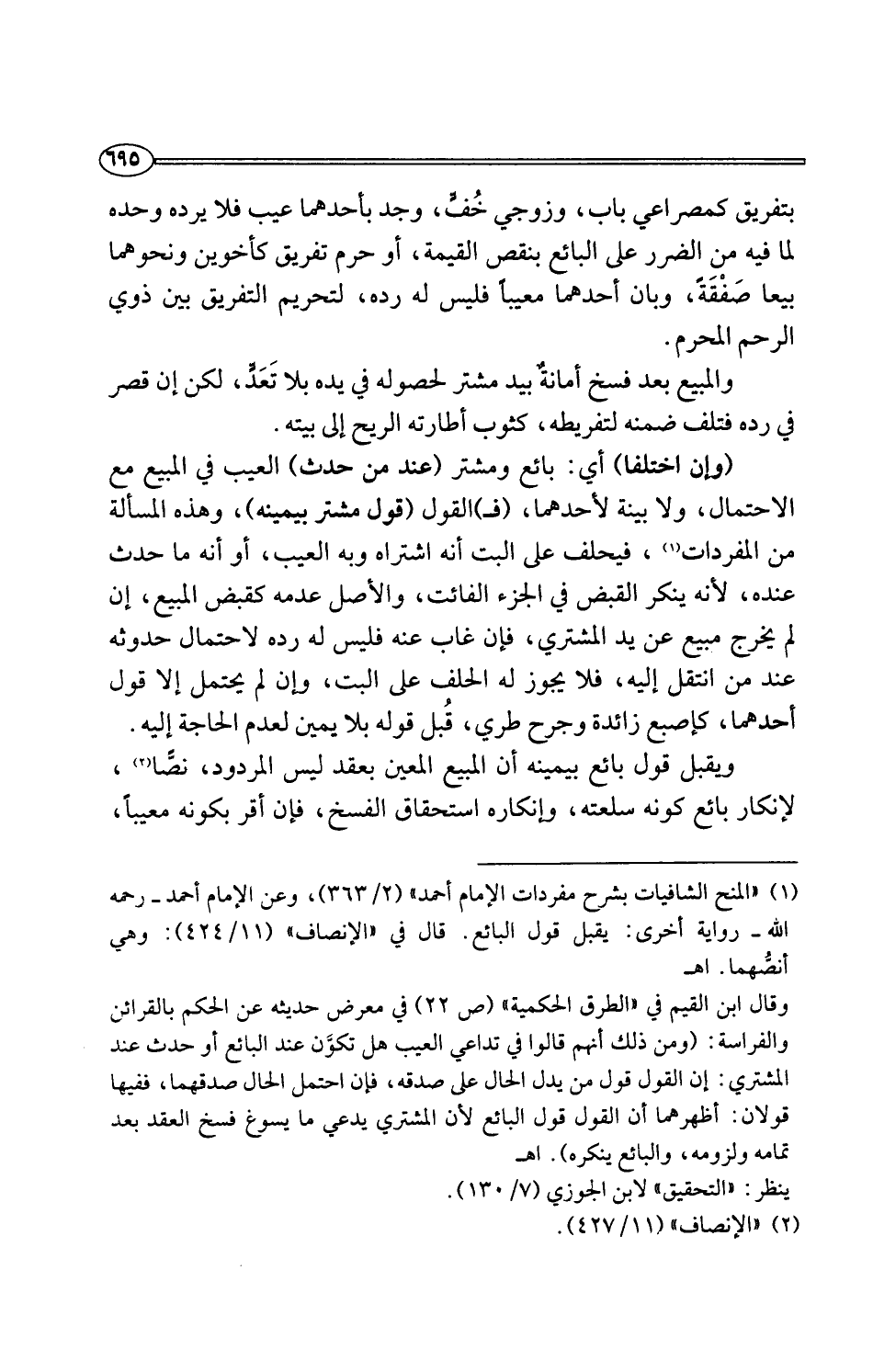 (¬1) "المنح الشافيات بشرح مفردات الإمام أحمد" (2/ 363)، وعن الإمام أحمد -رحمه اللَّه- رواية أخرى: يقبل قول البائع. قال في "الإنصاف" (11/ 424): وهي أنصُّهما. اهـ
