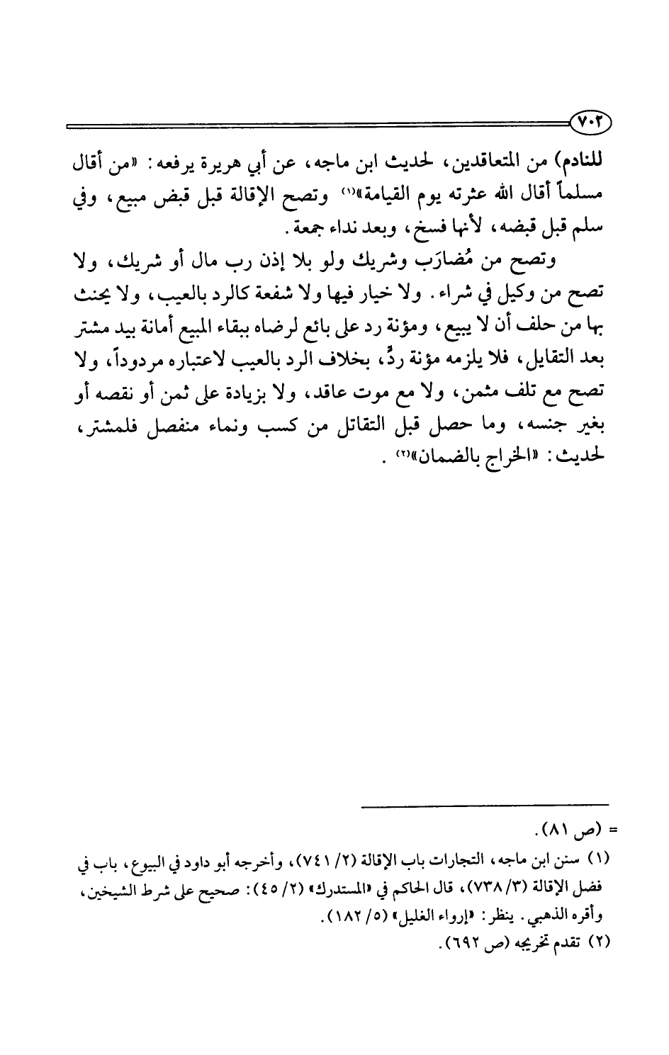 وتصح من مُضارَب وشريك ولو بلا إذن رب مال أو شريك، ولا تصح من وكيل في شراء. ولا خيار فيها ولا شفعة كالرد بالعيب، ولا يحنث بها من حلف أن لا يبيع، ومؤنة رد على بائع لرضاه ببقاء المبيع أمانة بيد مشتر بعد التقايل، فلا يلزمه مؤنة ردٍّ، بخلاف الرد بالعيب لاعتباره مردودًا، ولا تصح مع تلف مثمن، ولا مع موت عاقد، ولا بزيادة على ثمن أو نقصه أو بغير جنسه، وما حصل قبل التقاتل من كسب ونماء منفصل فلمشتر، لحديث: "الخراج بالضمان" (¬2).