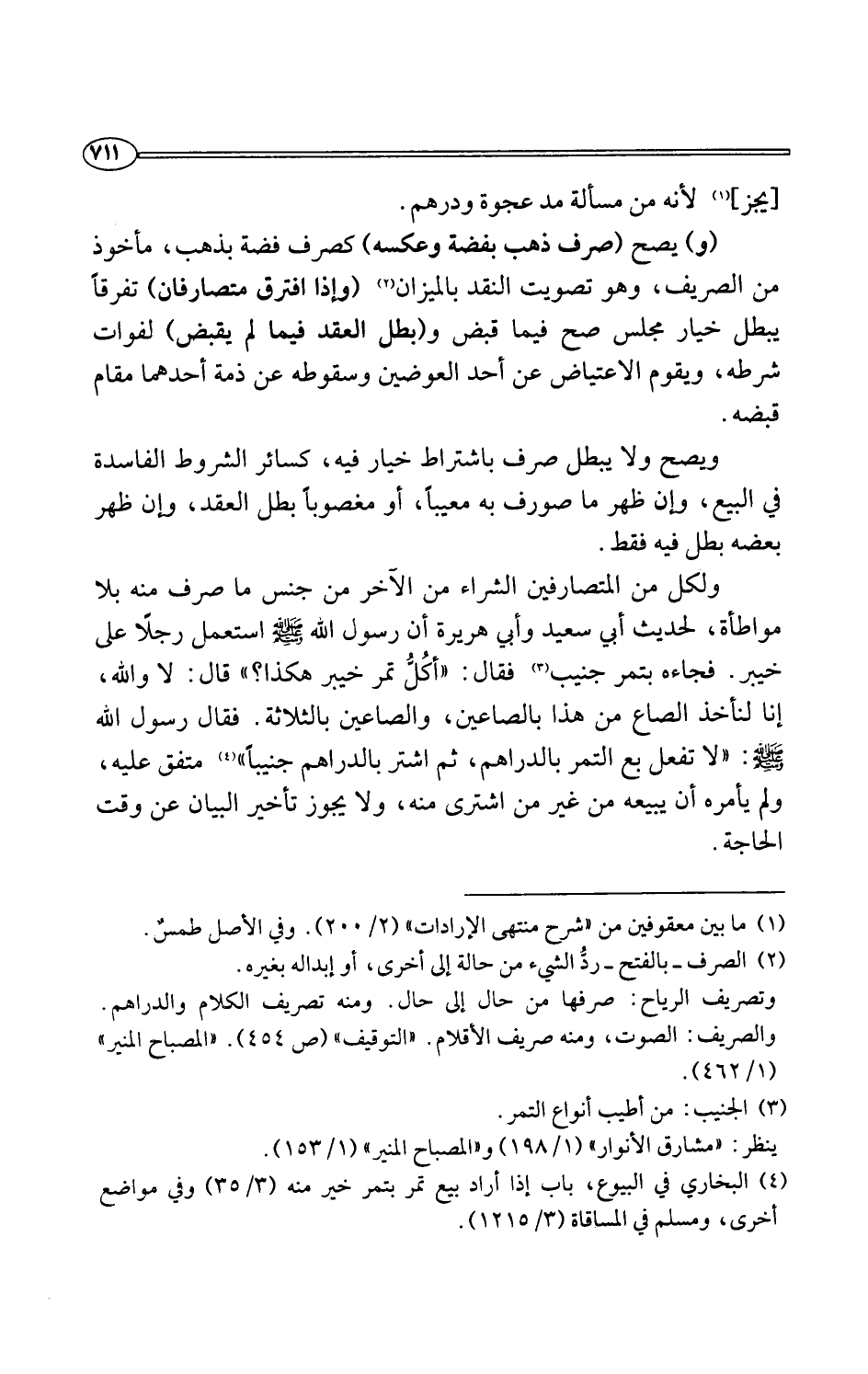 ولكل من المتصارفين الشراء من الآخر من جنس ما صرف منه بلا مواطأة، لحديث أبي سعيد وأبي هريرة أن رسول اللَّه -صلى اللَّه عليه وسلم- استعمل رجلًا على خيبر. فجاءه بتمر جنيب (¬3) فقال: "أكُلُّ تمر خيبر هكذا؟ " قال: لا واللَّه، إنا لنأخذ الصاع من هذا بالصاعين، والصاعين بالثلاثة. فقال رسول اللَّه -صلى اللَّه عليه وسلم-: "لا تفعل بع التمر بالدراهم، ثم اشتر بالدراهم جنيبًا" (¬4) متفق عليه، ولم يأمره أن يبيعه من غير من اشترى منه، ولا يجوز تأخير البيان عن وقت الحاجة.