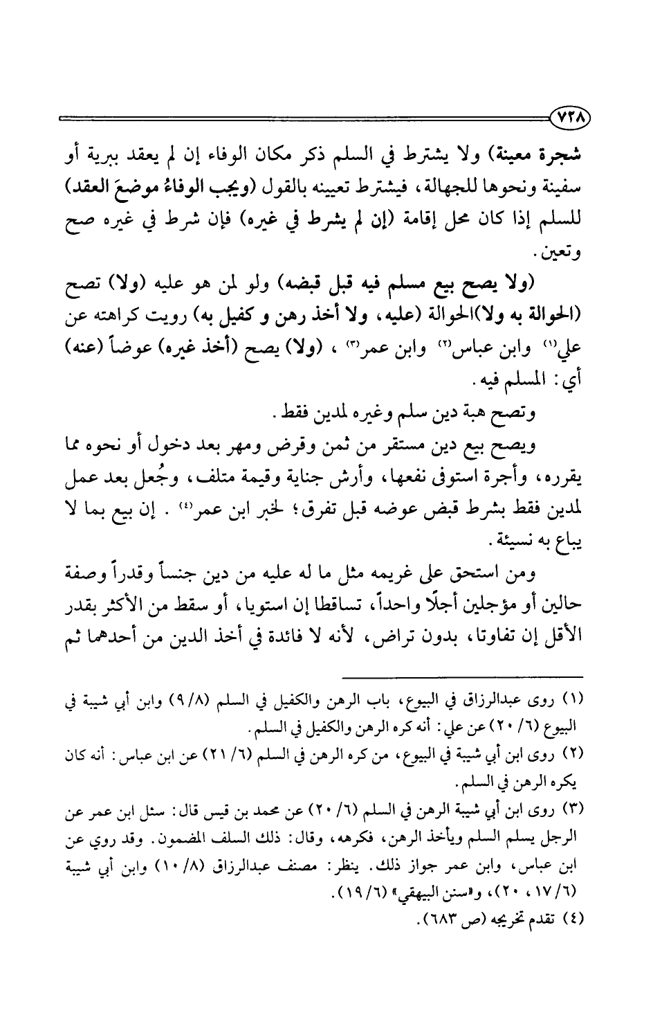(¬3) روى ابن أبي شيبة الرهن في السلم (6/ 20) عن محمد بن قيس قال: سئل ابن عمر عن الرجل يسلم السلم ويأخذ الرهن، فكرهه، وقال: ذلك السلف المضمون. وقد روي عن ابن عباس، وابن عمر جواز ذلك. ينظر: مصنف عبد الرزاق (8/ 10) وابن أبي شيبة (6/ 17، 20)، و"سنن البيهقي" (6/ 19).