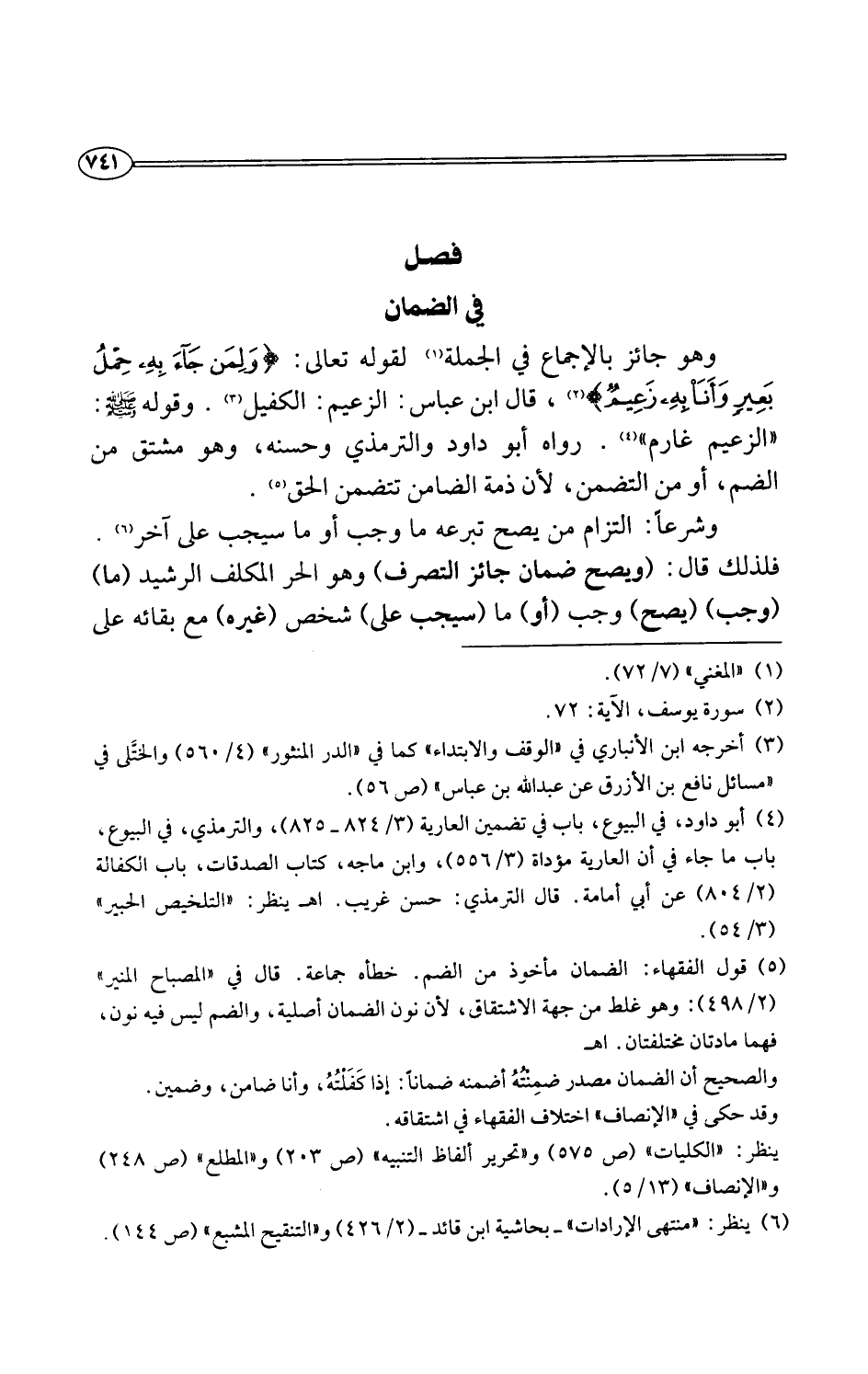 (¬5) قول الفقهاء: الضمان مأخوذ من الضم. خطأه جماعة. قال في "المصباح المنير" (2/ 498): وهو غلط من جهة الاشتقاق، لأن نون الضمان أصلية، والضم ليس فيه نون، فهما مادتان مختلفتان. اهـ