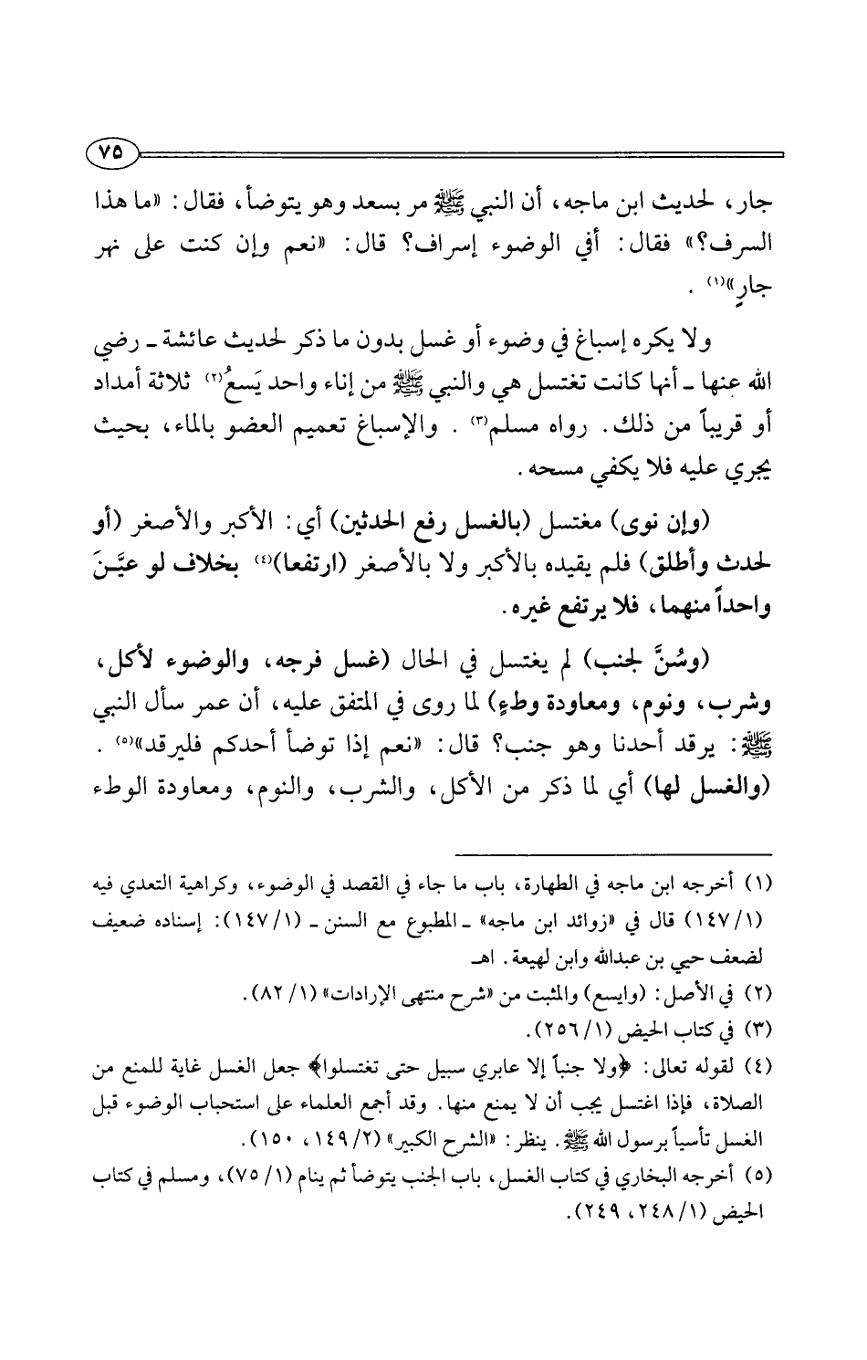 جار، لحديث ابن ماجة، أن النبي -صلى اللَّه عليه وسلم- مر بسعد وهو يتوضأ، فقال: "ما هذا السرف؟ " فقال: أفي الوضوء إسراف؟ قال: "نعم وإن كنت على نهر جارٍ" (¬1).