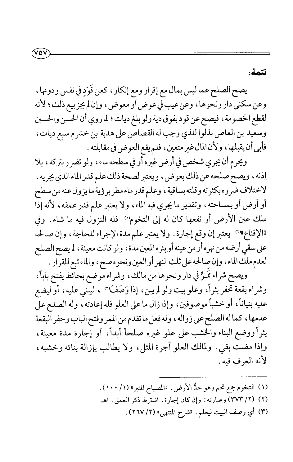 ويحرم أن يجري شخص في أرض غيره أو في سطحه ماء، ولو تضرر بتركه، بلا إذنه، ويصح صلحه عن ذلك بعوض، ويعتبر لصحة ذلك علم قدر الماء الذي يجريه، لاختلاف ضرره بكثرته وقلته بساقية، وعلم قدر ماء مطر برؤية ما يزول عنه من سطح أو أرض أو بمساحته، وتقدير ما يجري فيه الماء، ولا يعتبر علم قدر عمقه، لأنه إذا ملك عين الأرض أو نفعها كان له إلى التخوم (¬1) فله النزول فيه ما شاء. وفي "الإقناع" (¬2) يعتبر إن وقع إجارة. ولا يعتبر علم مدة الإجراء للحاجة، وإن صالحه على سقي أرضه من نهره أو من عينه أو بئره العين مدة، ولو كانت معينة، لم يصح الصلح لعدم ملك الماء، وإن صالحه على ثلث النهر أو العين ونحوه صح، والماء تبع للقرار.