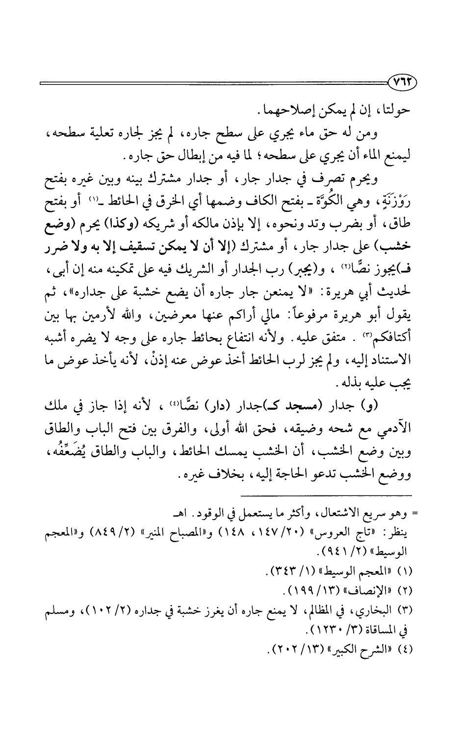 ويحرم تصرف في جدار جار، أو جدار مشترك بينه وبين غيره بفتح رَوْزَنَةٍ، وهي الكُوَّة -بفتح الكاف وضمها أي الخرق في الحائط- (¬1) أو بفتح طاق، أو بضرب وقد ونحوه، إلا بإذن مالكه أو شريكه (وكذا) يحرم (وضع خشب) على جدار جار، أو مشترك (إلا أن لا يمكن تسقيف إلا به ولا ضرر فـ) يجوز نصًّا (¬2)، و (يجبر) رب الجدار أو الشريك فيه على تمكينه منه إن أبي، لحديث أبي هريرة: "لا يمنعن جار جاره أن يضع خشبة على جداره"، ثم يقول أبو هريرة مرفوعًا: مالي أراكم عنها معرضين، واللَّه لأرمين بها بين أكتافكم (¬3). متفق عليه. ولأنه انتفاع بحائط جاره على وجه لا يضره أشبه الاستناد إليه، ولم يجز لرب الحائط أخذ عوض عنه إذنْ، لأنه يأخذ عوض ما يجب عليه بذله.
