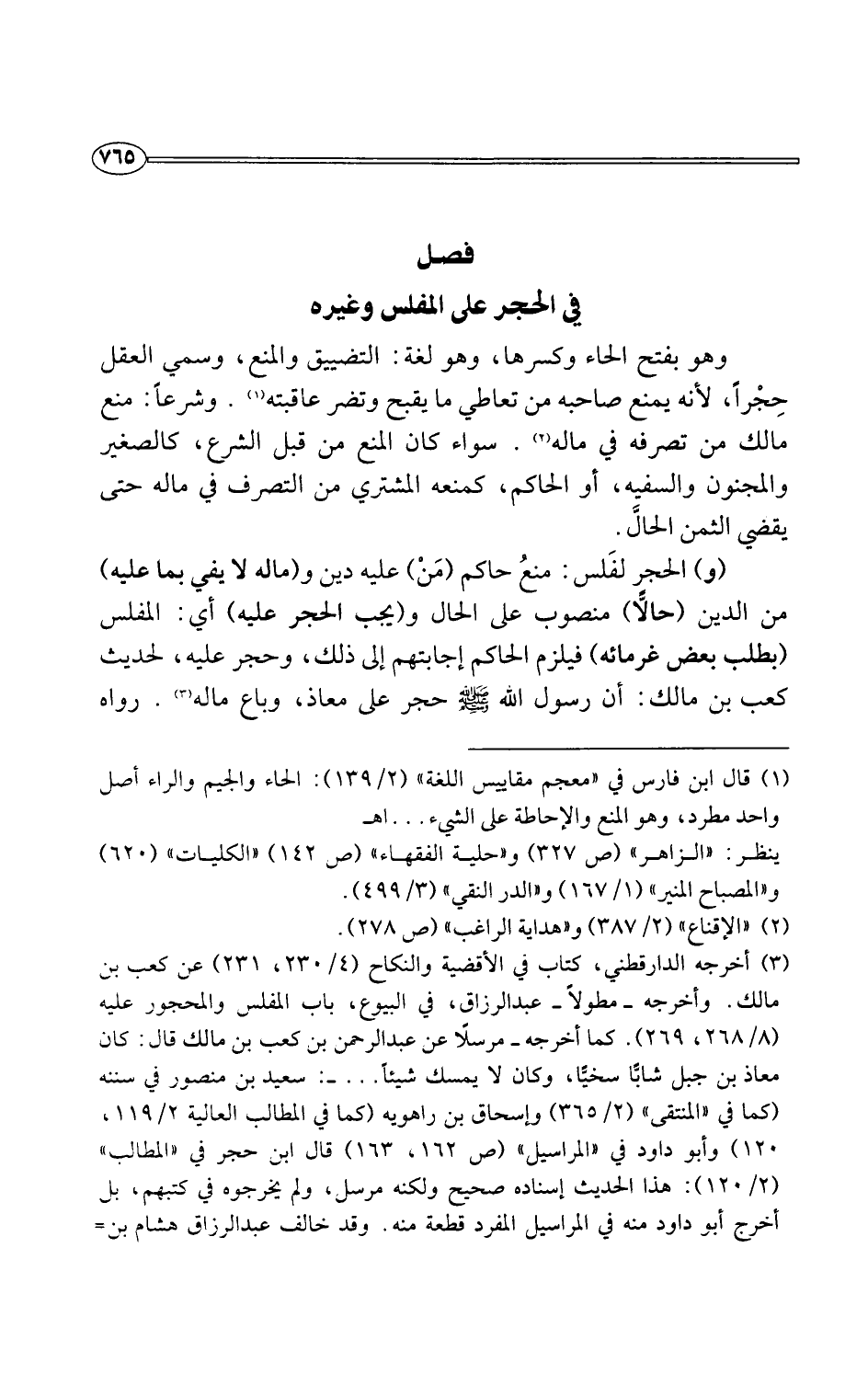 وهو بفتح الحاء وكسرها، وهو لغة: التضييق والمنع، وسمي العقل حِجْرًا، لأنه يمنع صاحبه من تعاطي ما يقبح وتضر عاقبته (¬1). وشرعًا: منع مالك من تصرفه في ماله (¬2). سواء كان المنع من قبل الشرع، كالصغير والمجنون والسفيه، أو الحاكم، كمنعه المشتري من التصرف في ماله حتى يقضي الثمن الحالَّ.
