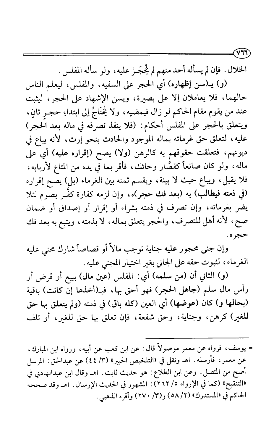 (و) يـ (سن إظهاره) أي الحجر على السفيه، والمفلس، ليعلم الناس حالهما، فلا يعاملان إلا على بصيرة، ويسن الإشهاد على الحجر، ليثبت عند من يقوم مقام الحاكم لو زال فيمضيه، ولا يحتَاجُ إلى ابتداءِ حجرٍ ثانٍ، ويتعلق بالحجر على المفلس أحكام: (فلا ينفذ تصرفه في ماله بعد الحجر) عليه، لتعلق حق غرمائه بماله الموجود والحادث بنحو إرث، لأنه يباع في ديونهم، فتعلقت حقوقهم به كالرهن (ولا) يصح (إقراره عليه) أي على ماله، ولو كان صانعًا كقصَّار وحائك، فأقر بما في يده من المتاع لأربابه، فلا يقبل، ويباع حيث لا بينة، ويقسم ثمنه بين الغرماء (بل) يصح إقراره (في ذمته فيطالب) به (بعد فك حجر) هـ، وإن لزمه كفارة كفَّر بصوم لئلا يضر بغرمائه، وإن تصرف في ذمته بشراء أو إقرار أو إصداق أو ضمان صح، لأنه أهل للتصرف، والحجر يتعلق بماله، لا بذمته، ويتبع به بعد فك حجره.