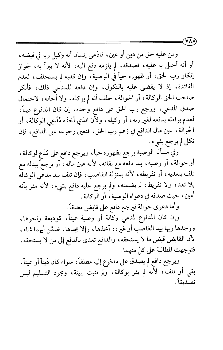 ويرجع دافع لم يصدق على مدفوع إليه مطلقًا، سواء كان دَينًا أو عينًا، بقي أو تلف، لأنه لم يقر بوكالة، ولم تثبت ببينة، ومجرد التسليم ليس تصديقًا.
