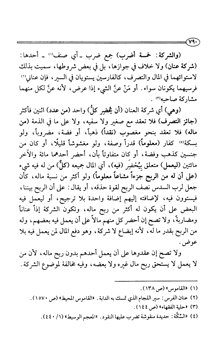(وهي) أي شركة العنان (أن يُحضِر كلُّ) واحد (من عدد) اثنين فأكثر (جائز التصرف) فلا تعقد مع صغير ولا سفيه، ولا على ما في الذمة (من ماله) فلا تعقد بنحو مغصوب (نقدًا) ذهبًا، أو فضة، مضروبًا، ولو بسكة (¬4) كفار (معلومًا) قدرًا وصفة، ولو مغشوشًا قليلًا، أو كان من جنسين كذهب وفضة، أو كان متفاوتًا بأن، أحضر أحدهما مائة والآخر مائتين (ليعمل) متعلق بِيُحْضِر (فيه)، أي المال جميعه (كلٌّ) من له فيه شيء (على أن له من الربح جزءًا مشاعًا معلومًا) ولو أكثر من نسبة ماله، كأن جعل لرب السدس نصف الربح لقوة حذقه، أو يقال: على أن الربح بيننا، فيستوون فيه، لإضافته إليهم إضافة واحدة بلا ترجيح، أو ليعمل فيه البعض على أن يكون له أكثر من ربح ماله، وتكون الشركة إذًا عنانًا ومضاربةً، ولا تصح إن أحضر كل منهم مالًا على أن يعمل فيه بعضهم، وله من الربح بقدر ما له، لأنه إبضاع لا شركة، وهو دفع المال لمن يعمل فيه بلا عوض.