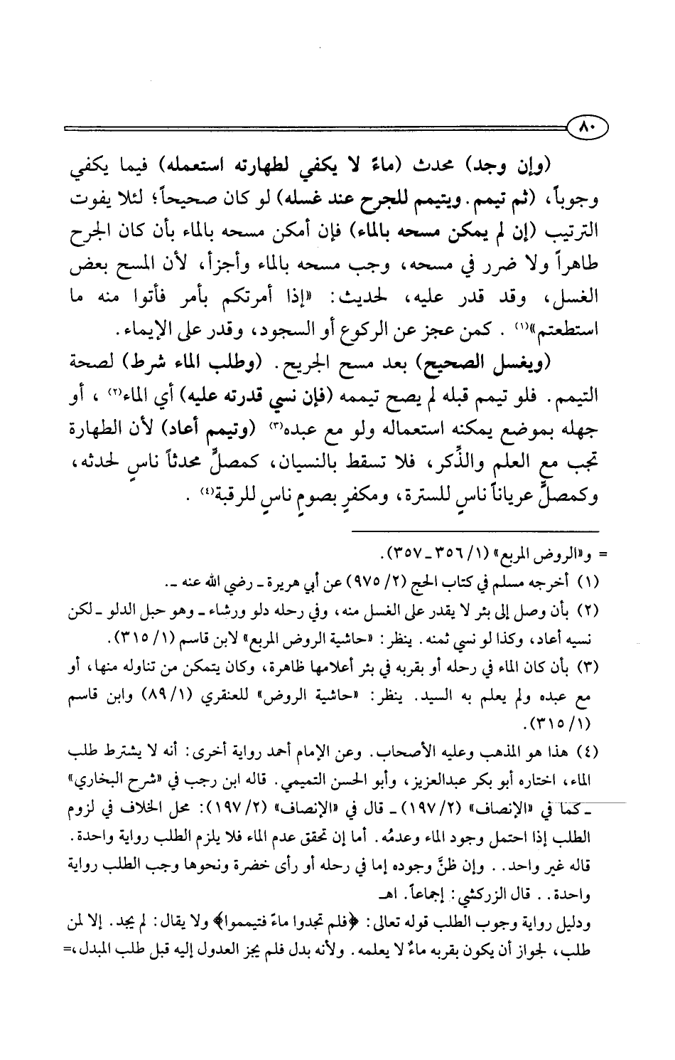 (¬4) هذا هو المذهب وعليه الأصحاب. وعن الإمام أحمد رواية أخرى: أنه لا يشترط طلب الماء، اختاره أبو بكر عبد العزيز، وأبو الحسن التميمي. قاله ابن رجب في "شرح البخاري" كما في "الإنصاف" (2/ 197) -قال في "الإنصاف" (2/ 197): محل الخلاف في لزوم الطلب إذا احتمل وجود الماء وعدمُه. أنها إن تحفق عدم الماء فلا يلزم الطلب رواية واحدة. قاله غير واحد. . وإن ظنَّ وجوده إمّا في رحله أو رأق خضرة ونحوها وجب الطلب رواية واحدة. . قال الزركشي: إجماعًا. اهـ