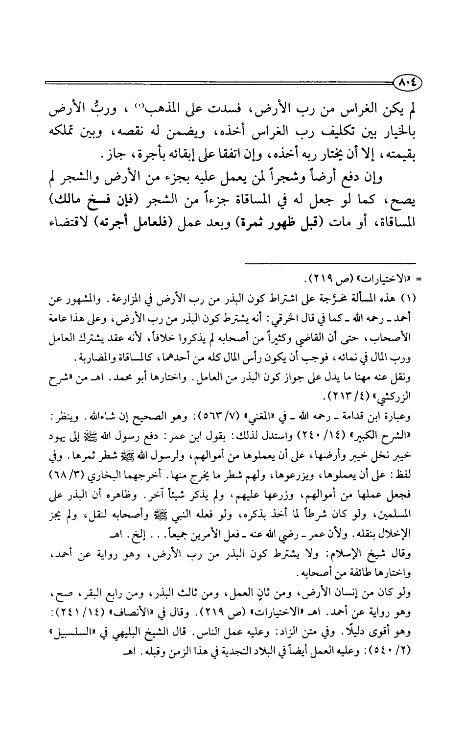 وعبارة ابن قدامة -رحمه اللَّه- في "المغني" (7/ 563): وهو الصحيح إن شاء اللَّه. وينظر: "الشرح الكبير" (14/ 240) واستدل بذلك: بقول ابن عمر: دفع رسول اللَّه -صلى اللَّه عليه وسلم- إلى يهود خيبر نخل خيبر وأرضها، على أن يعملوها من أموالهم، ولرسول اللَّه -صلى اللَّه عليه وسلم- شطر ثمرها. وفي لفظ: على أن يعملوها، ويزرعوها، ولهم شطر ما يخرج منها. أخرجهما البخاري (3/ 68) فجعل عملها من أموالهم، وزرعها عليهمء ولم يذكر شيئًا آخر. وظاهره أن البذر على المسلمين، ولو كان شرطًا لما أخذ بذكره، ولو فعله النبي -صلى اللَّه عليه وسلم- وأصحابه لنقل، ولم يجز الإخلال بنقله. ولأن عمر -رضي اللَّه عنه- فعل الأمرين جميعًا. . . إلخ. اهـ