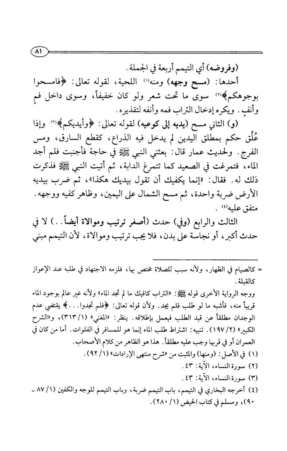 (¬4) أخرجه البخاري في التيمم، باب التيمم ضربة، وباب التيمم للوجه والكفين (1/ 87 - 90)، ومسلم في كتاب الحيض (1/ 280).