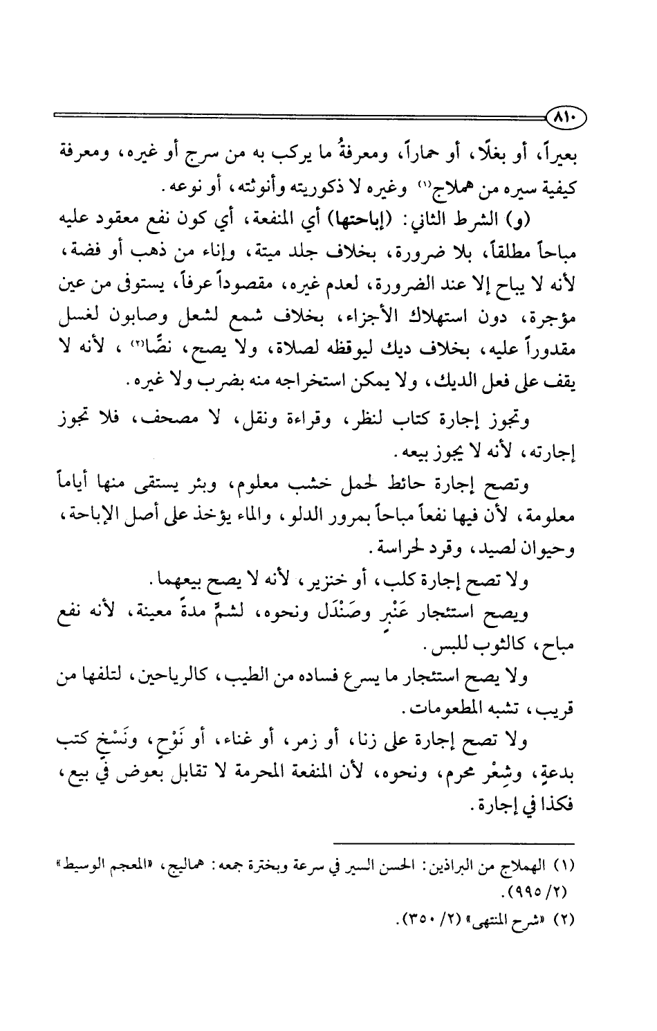 (و) الشرط الثاني: (إباحتها) أي المنفعة، أي كون نفع معقود عليه مباحًا مطلقًا، بلا ضرورة، بخلاف جلد ميتة، وإناء من ذهب أو فضة، لأنه لا يباح إلا عند الضرورة، لعدم غيره، مقصودًا عرفًا، يستوفى من عين مؤجرة، دون استهلاك الأجزاء، بخلاف شمع لشعل وصابون لغسل مقدورًا عليه، بخلاف ديك ليوقظه لصلاة، ولا يصح، نصًّا (¬2)، لأنه لا يقف على فعل الديك، ولا يمكن استخراجه منه بضرب ولا غيره.