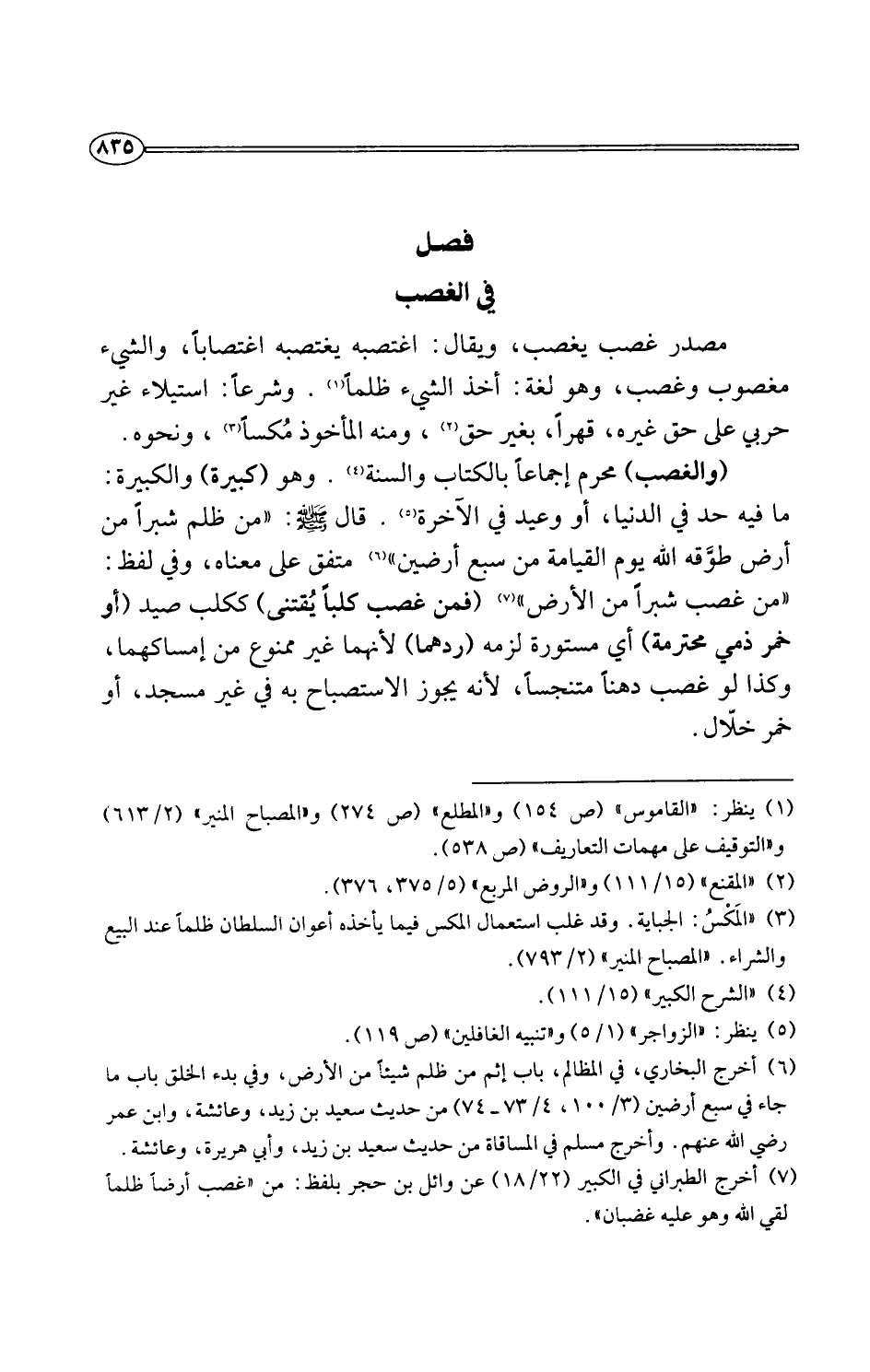 (والغصب) محرم إجماعًا بالكتاب والسنة (¬4). وهو (كبيرة) والكبيرة: ما فيه حد في الدنيا، أو وعيد في الآخرة (¬5). قال -صلى اللَّه عليه وسلم-: "من ظلم شبرًا من أرض طوَّقه اللَّه يوم القيامة من سبع أرضين" (¬6) متفق على معناه، وفي لفظ: "من غصب شبرًا من الأرض" (¬7) (فمن غصب كلبًا يُقتنى) ككلب صيد (أو خمر ذمي محترمة) أي مستورة لزمه (ردهما) لأنهما غير ممنوع من إمساكهما، وكذا لو غصب دهنًا متنجسًا، لأنه يجوز الاستصباح به في غير مسجد، أو خمر خلّال.