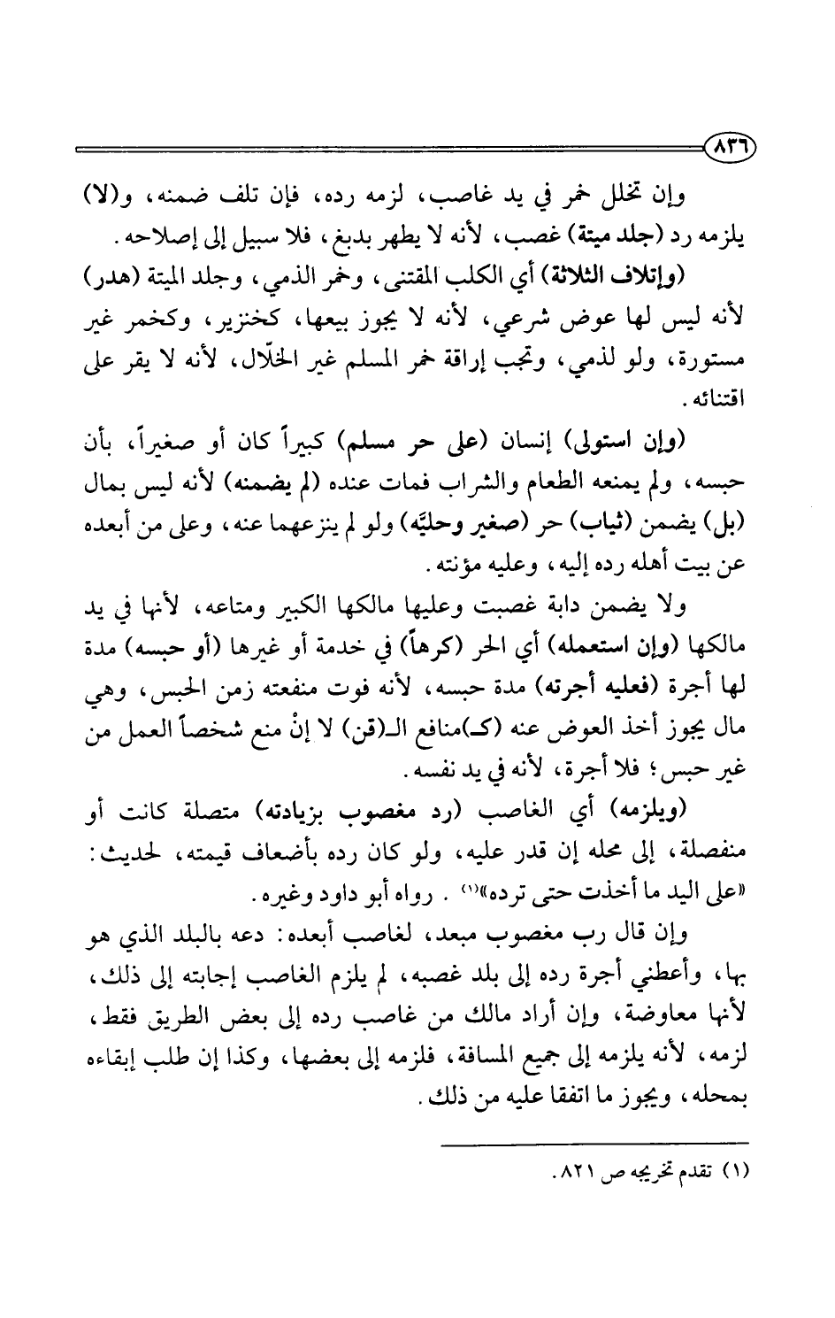 (ويلزمه) أي الغاصب (رد مغصوب بزيادته) متصلة كانت أو منفصلة، إلى محله إن قدر عليه، ولو كان رده بأضعاف قيمته، لحديث: "على اليد ما أخذت حتى ترده" (¬1). رواه أبو داود وغيره.