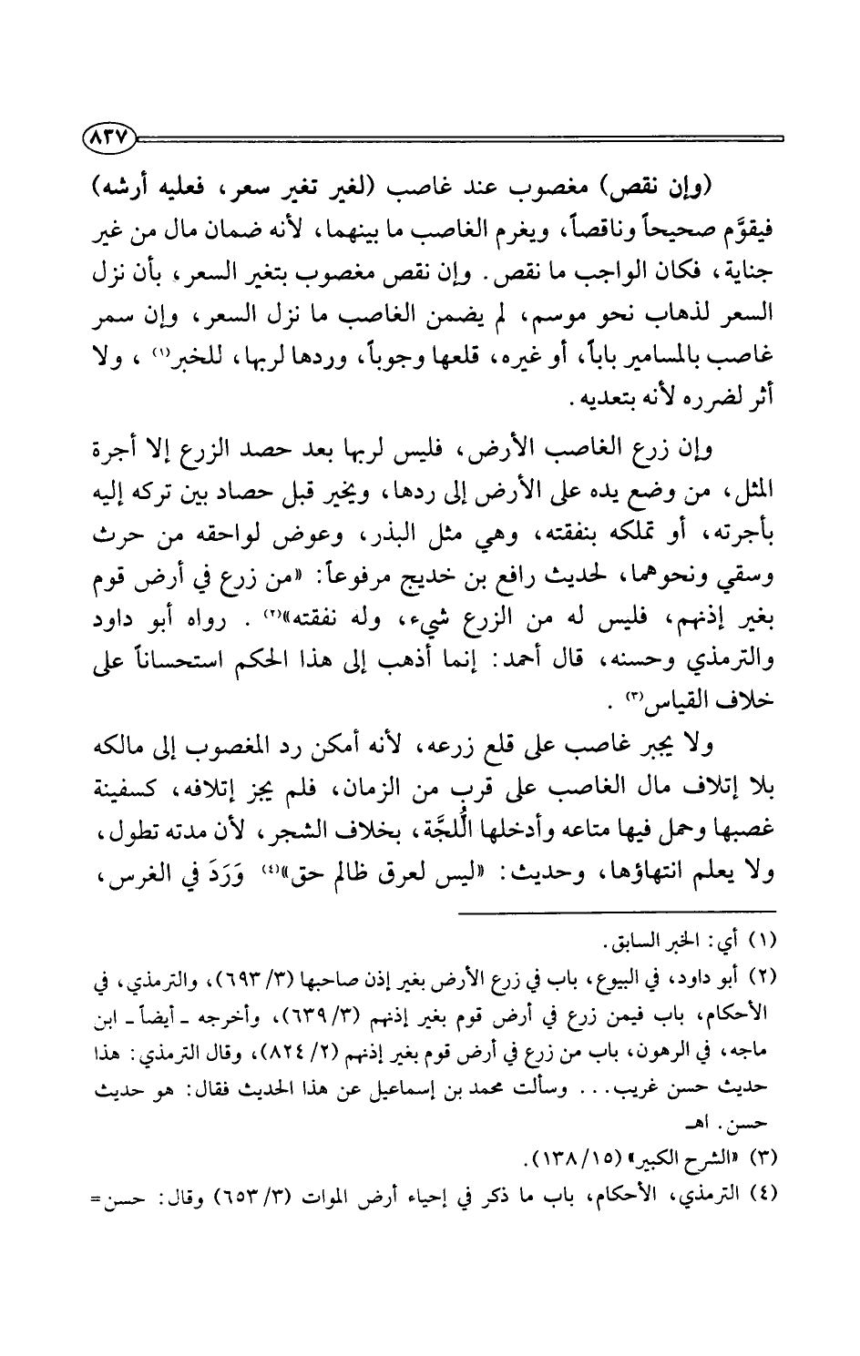 (¬2) أبو داود، في البيوع، باب في زرع الأرض بغير إذن صاحبها (3/ 693)، والترمذي، في الأحكام، باب فيمن زرع في أرضر قوم بغير إذنهم (3/ 639)، وأخرجه -أيضًا- ابن ماجه، في الرهون، باب من زرع في أرض قوم بغير إذنهم (2/ 824)، وقال الترمذي: هذا حديث حسن غريب. . . وسألت محمد بن إسماعيل عن هذا الحديث فقال: هو حديث حسن. اهـ