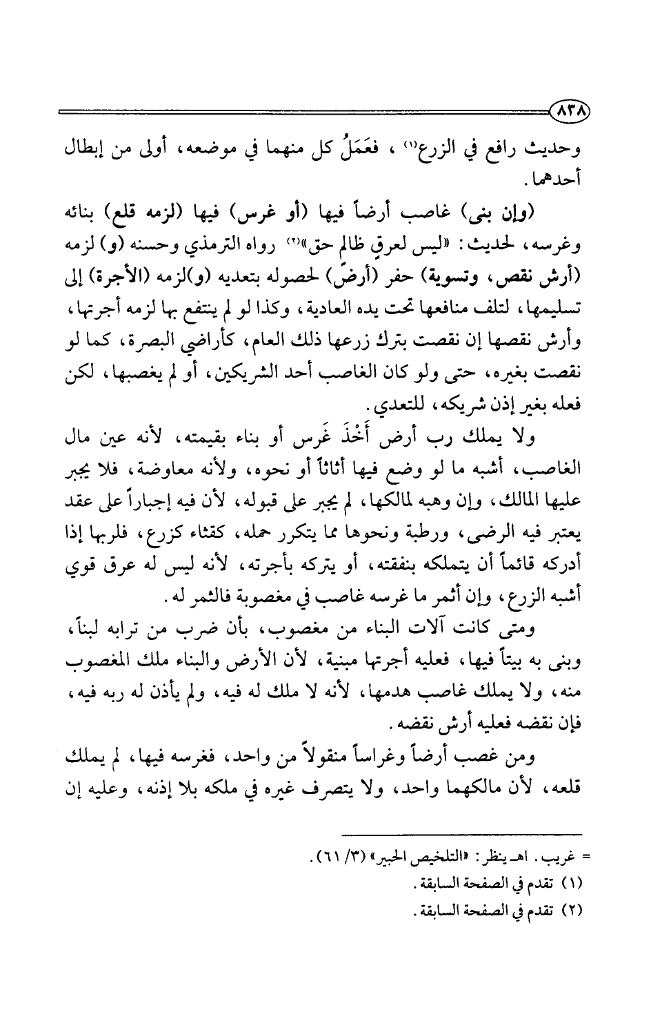 (وإن بنى) غاصب أرضًا فيها (أو غرس) فيها (لزمه قلع) بنائه وغرسه، لحديث: "ليس لعرقٍ ظالمٍ حق" (¬2) رواه الترمذي وحسنه (و) لزمه (أرش نقص، وتسوية) حفر (أرض) لحصوله بتعديه (و) لزمه (الأجرة) إلى تسليمها، لتلف منافعها تحت يده العادية، وكذا لو لم يتفع بها لزمه أجرتها، وأرش نقصها إن نقصت بترك زرعها ذلك العام، كأراضي البصرة، كما لو نقصت بغيره، حتى ولو كان الغاصب أحد الشريكين، أو لم يغصبها، لكن فعله بغير إذن شريكه، للتعدي.