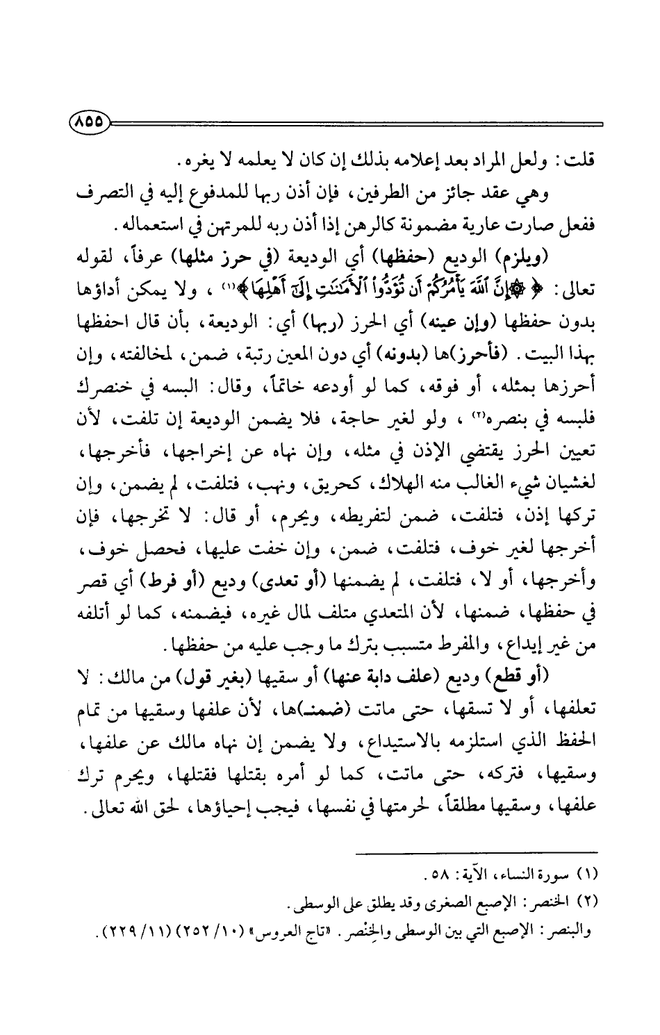 (ويلزم) الوديع (حفظها) أي الوديعة (في حرز مثلها) عرفًا، لقوله تعالى: {إِنَّ اللَّهَ يَأْمُرُكُمْ أَنْ تُؤَدُّوا الْأَمَانَاتِ إِلَى أَهْلِهَا} (¬1)، ولا يمكن أداؤها بدون حفظها (وإن عينه) أي الحرز (ربها) أي: الوديعة، بأن قال احفظها بهذا البيت. (فأحرز) ها (بدونه) أي دون المعهين رتبة، ضمن، لمخالفته، وإن أحرزها بمثله، أو فوقه، كما لو أودعه خاتمًا، وقال: البسه في خنصرك فلبسه في بنصره (¬2)، ولو لغير حاجة، فلا يضمن الوديعة إن تلفت، لأن تعيين الحرز يقتضي الإذن في مثله، وإن نهاه عن إخراجها، فأخرجها، لغشيان شيء الغالب منه الهلاك، كحريق، ونهب، فتلفت، لم يضمن، وإن تركها إذن، فتلفت، ضمن لتفريطه، ويحرم، أو قال: لا تخرجها، فإن أخرجها لغير خوف، فتلفت، ضمن، وإن خفت عليها، فحصل خوف، وأخرجها، أو لا، فتلفت، لم يضمنها (أو تعدى) وديع (أو فرط) أي قصر في حفظها، ضمنها، لأن المتعدي متلف لمال غيره، فيضمنه، كما لو أتلفه من غير إيداع، والمفرط متسبب بترك ما وجب عليه من حفظها.