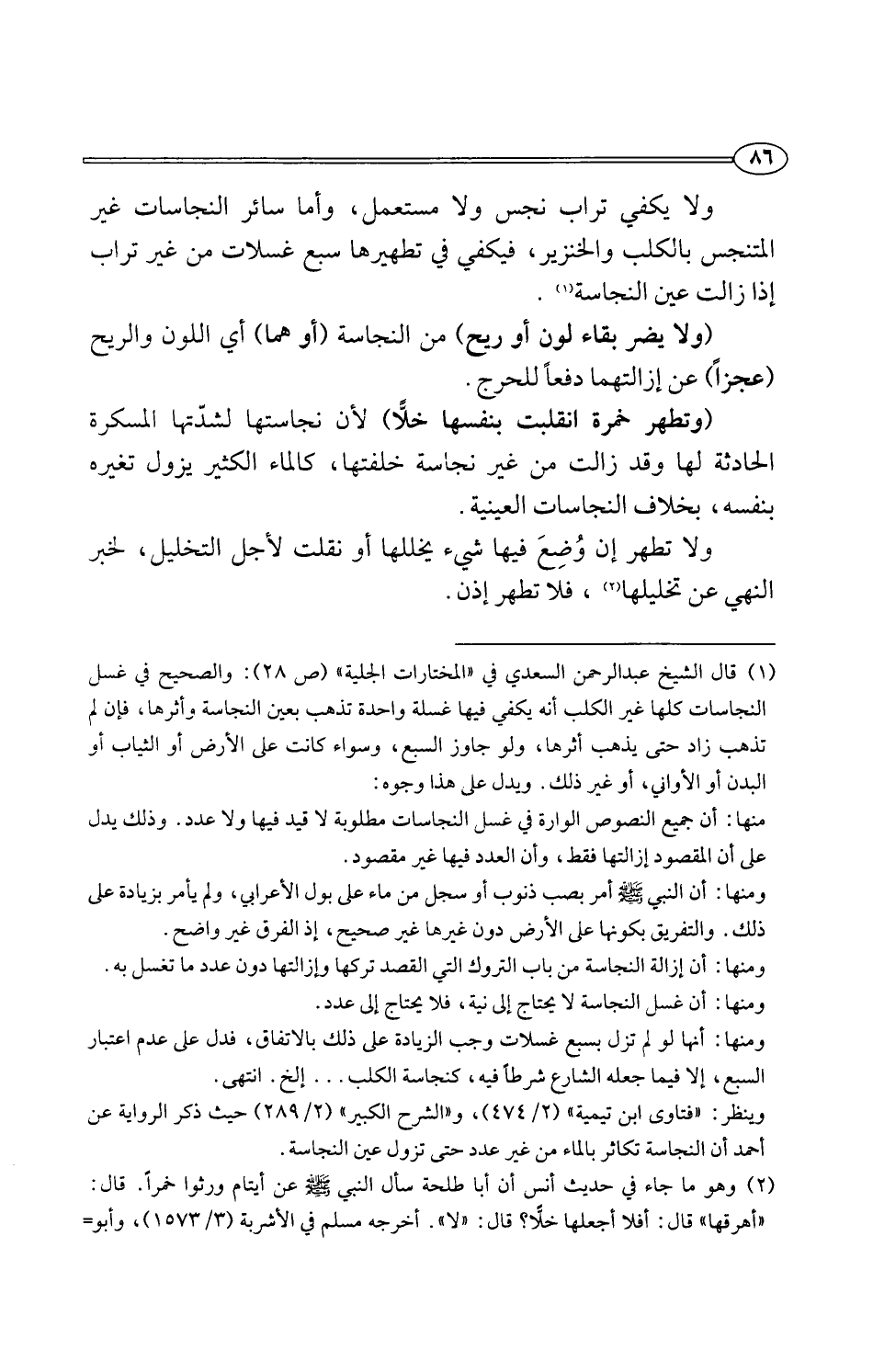 (¬1) قال الشيخ عبد الرحمن السعدي في "المختارات الجلية" (ص 28): والصحيح في غسل النجاسات كلها غير الكلب أنه يكفي فيها غسلة واحدة تذهب بعين النجاسة وأثرها، فإن لم تذهب زاد حتى يذهب أثرها، ولو جاوز السبع، وسواء كانت على الأرض أو الثياب أو البدن أو الأواني، أو غير ذلك. ويدل على هذا وجوه: