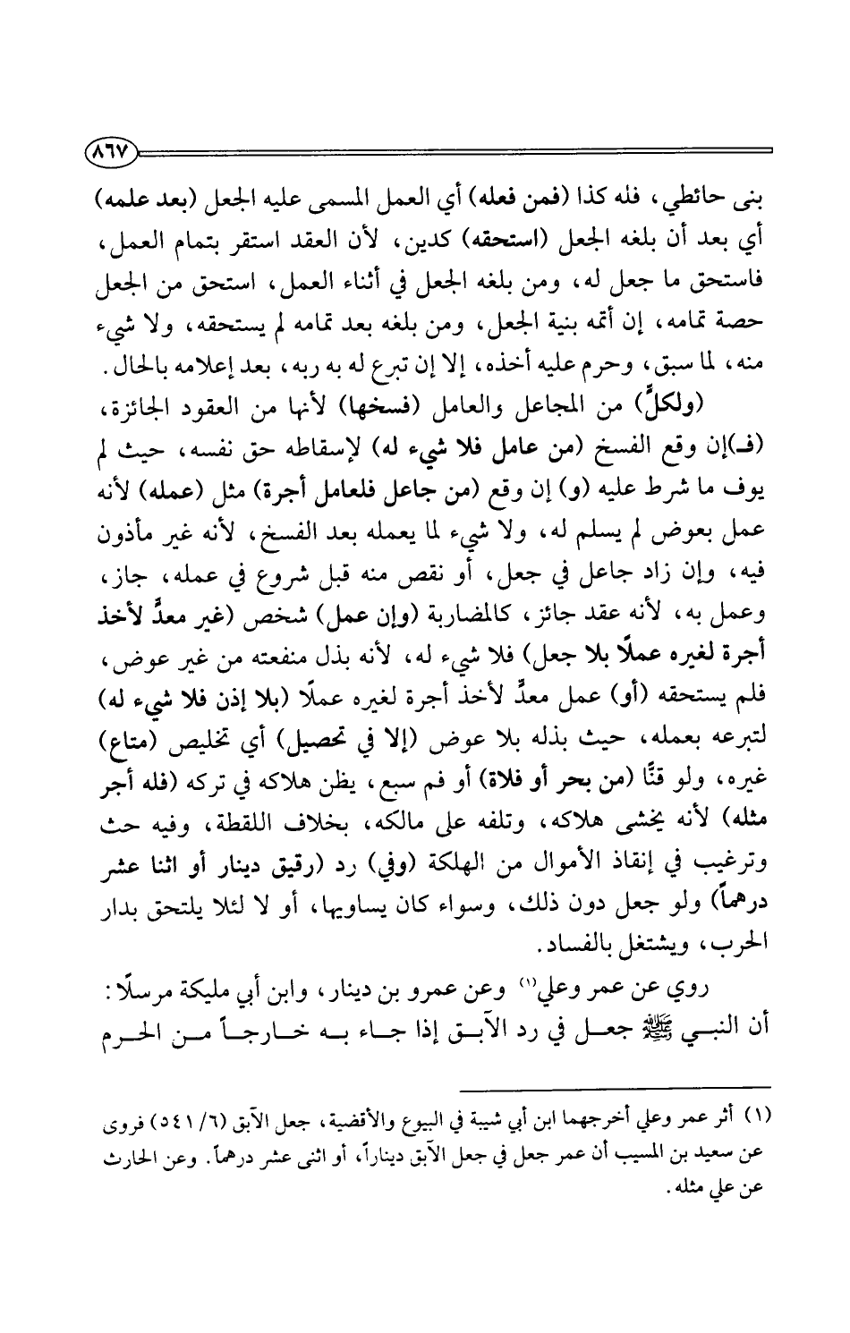 (¬1) أثر عمر وعلي أخرجهما ابن أبي شيبة في البيوع والأقضية، جعل الآبق (6/ 541) فروى عن سعيد بن المسيب أن عمر جعل في جعل الآبق دينارًا، أو اثنى عشر درهمًا. وعن الحارث عن علي مثله.
