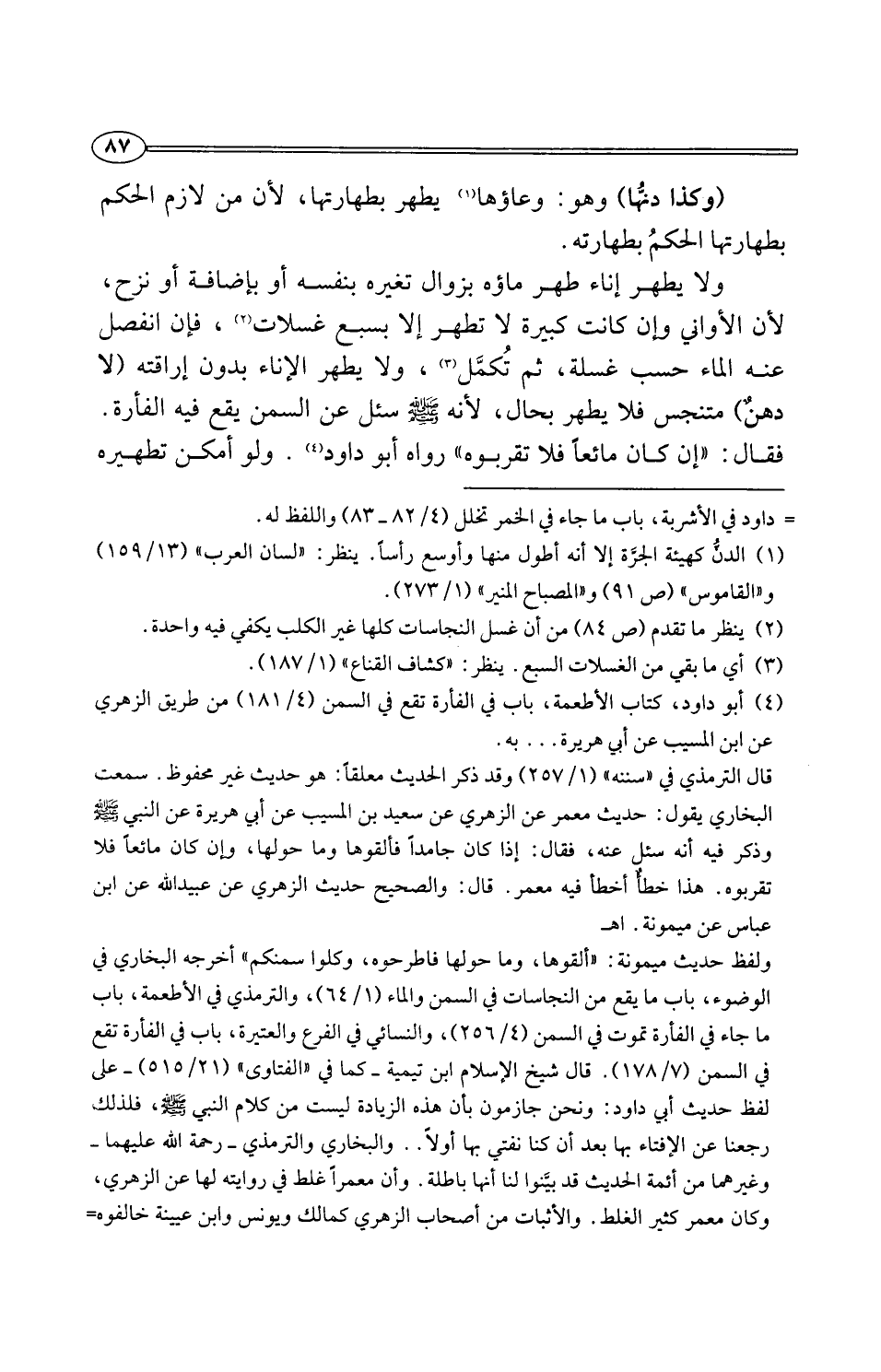 ولفظ حديث ميمونة: "ألقوها، وما حولها فاطرحوه، وكلوا سمنكم" أخرجه البخاري في الوضوء، باب ما يقع من النخاسات في السمن والماء (1/ 64)، والترمذي في الأطعمة، باب ما جاء في الفأرة تموت في السمن (4/ 256)، والنسائي في الفرع والعتيرة، باب في الفأرة تقع في السمن (7/ 178). قال شيخ الإسلام ابن تيمية -كما في "الفتاوى" (21/ 515) - على لفظ حديث أبي داود: ونحن جازمون بأن هذه الزيادة ليست من كلام النبي -صلى اللَّه عليه وسلم-، فلذلك رجعنا عن الإفتاء بها بعد أن كنا نفتي بها أولًا. . والبخاري والترمذي -رحمة اللَّه عليهما- وغيرهما من أئمة الحديث قد بيَّنوا لنا أنها باطلة. وأن معمرًا غلط في روايته لها عن الزهري، وكان معمر كثير الغلط. والأثبات من أصحاب الزهري كمالك ويونس وابن عيينة خالفوه =