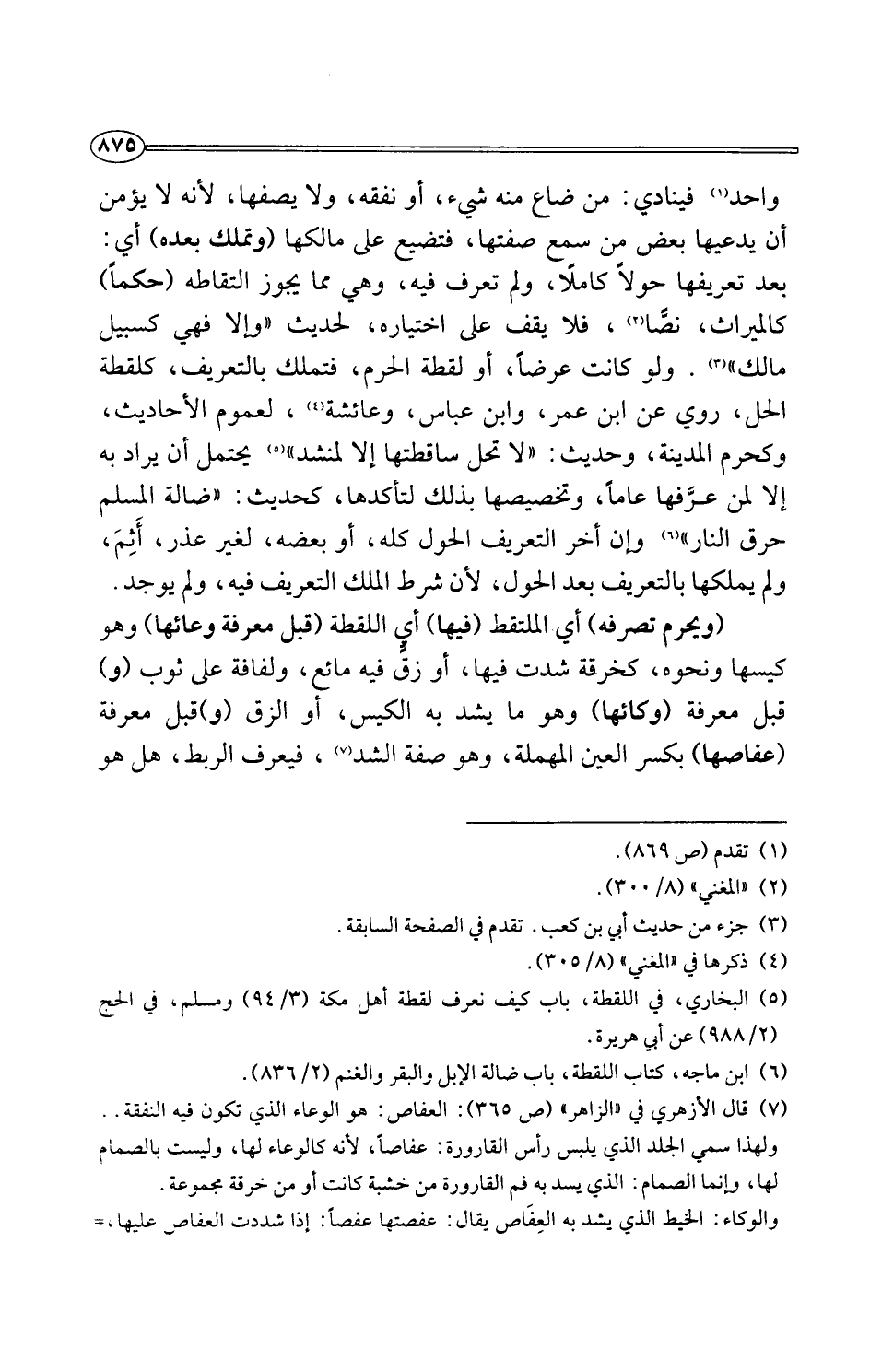 (¬7) قال الأزهري في "الزاهر" (ص 365): العفاص: هو الوعاء الذي تكون فيه النفقة .. ولهذا سمي الجلد الذي يلبس رأس القارورة: عفاصًا، لأنه كالوعاء لها، وليست بالصمام لها، وإنما الصمام: الذي يسد به فم القارورة من خشبة كانت أو من خرقة مجموعة.