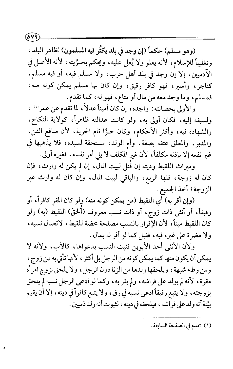 (وهو مسلم) حكمًا (إن وجد في بلد يكثُر فيه المسلمون) لظاهر البلد، وتغليبًا للإسلام، لأنه يعلو ولا يُعلى عليه، ويحكم بحرِّيته، لأنه الأصل في الآدميين، إلا إن وجد في بلد أهل حرب، ولا مسلم فيه، أو فيه مسلم، كتاجر، وأسير، فهو كافر رقيق، وإن كان بها مسلم يمكن كونه منه، فمسلم، وما وجد معه من مال أو متاع، فهو له، كما تقدم.