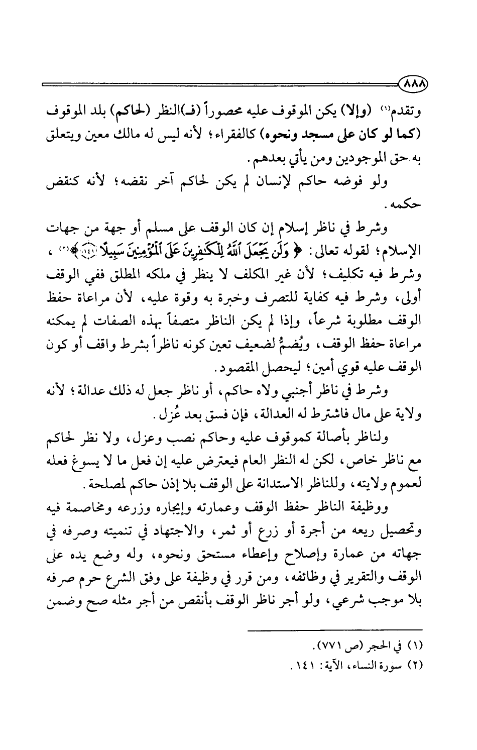 وشرط في ناظر إسلام إن كان الوقف على مسلم أو جهة من جهات الإسلام؛ لقوله تعالى: {وَلَنْ يَجْعَلَ اللَّهُ لِلْكَافِرِينَ عَلَى الْمُؤْمِنِينَ سَبِيلًا (141)} (¬2)، وشرط فيه تكليف؛ لأن غير المكلف لا ينظر في ملكه المطلق ففي الوقف أولى، وشرط فيه كفاية للتصرف وخبرة به وقوة عليه، لأن مراعاة حفظ الوقف مطلوبة شرعًا، وإذا لم يكن الناظر متصفًا بهذه الصفات لم يمكنه مراعاة حفظ الوقف، ويُضمُّ لضعيف تعين كونه ناظرًا بشرط واقف أو كون الوقف عليه قوي أمين؛ ليحصل المقصود.