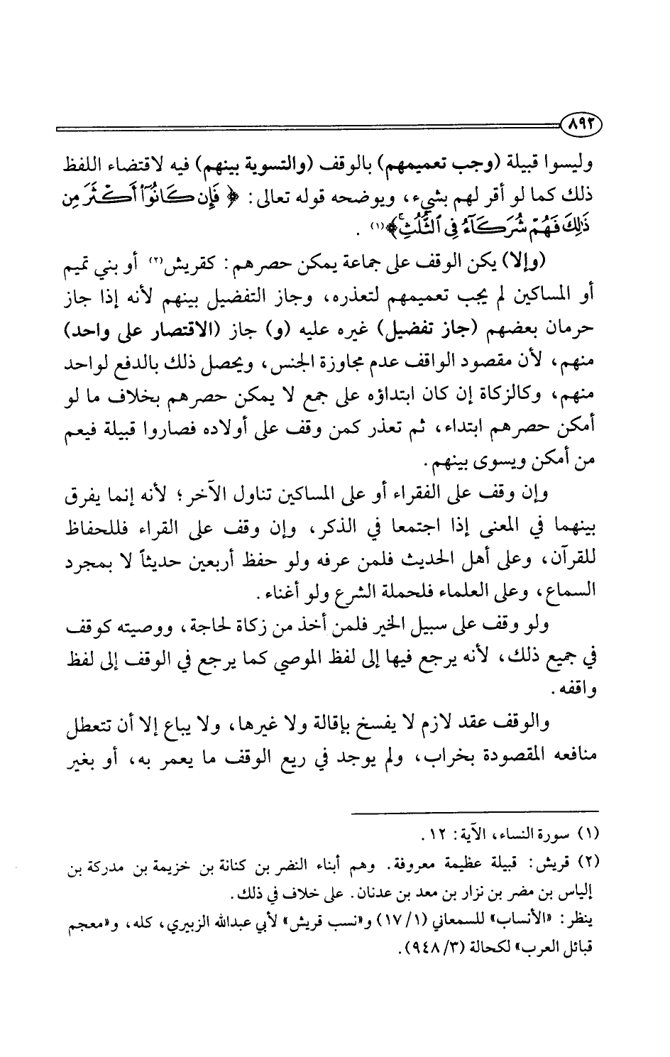 وليسوا قبيلة (وجب تعميمهم) بالوقف (والتسوية بينهم) فيه لاقتضاء اللفظ ذلك كما لو أقر لهم بشيء، ويوضحه قوله تعالى: {فَإِنْ كَانُوا أَكْثَرَ مِنْ ذَلِكَ فَهُمْ شُرَكَاءُ فِي الثُّلُثِ} (¬1).