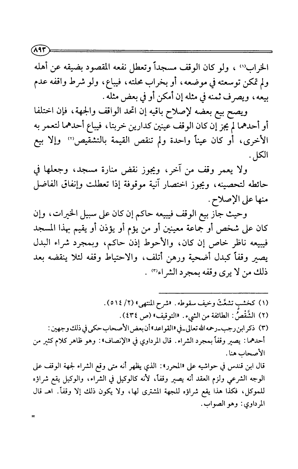 وحيث جاز بيع الوقف فيبيعه حاكم إن كان على سبيل الخيرات، وإن كان على شخص أو جماعة معينين أو من يؤم أو يؤذن أو يقيم بهذا المسجد فيبيعه ناظر خاص إن كان، والأحوط إذن حاكم، وبمجرد شراء البدل يصير وقفًا كبدل أضحية ورهن أتلف، والاحتياط وقفه لئلا ينقضه بعد ذلك من لا يرى وقفه بمجرد الشراء (¬3).