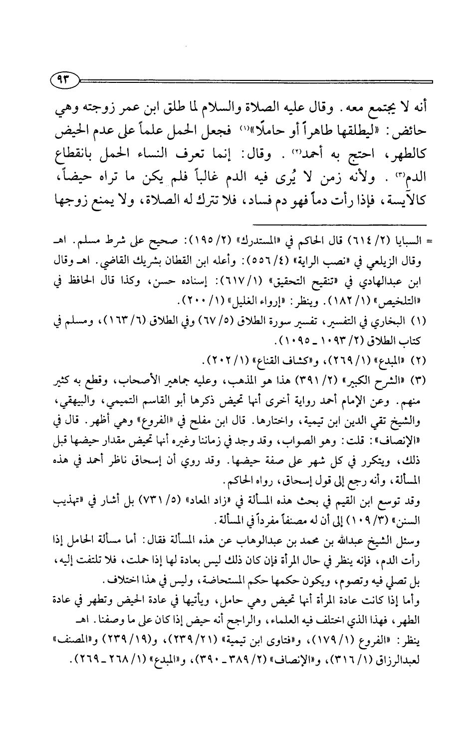 وسئل الشيخ عبد اللَّه بن محمد بن عبد الوهاب عن هذه المسألةُ فقال: أنها مسألة الحامل إذا رأت الدم، فإنه ينظر في حال المرأة فإن كان ذلك ليس بعادة لها إذا حملت، فلا تلتفت إليه، بل تصلي فيه وتصوم، ويكون حكمها حكم المستحاضة، وليس في هذا اختلاف.