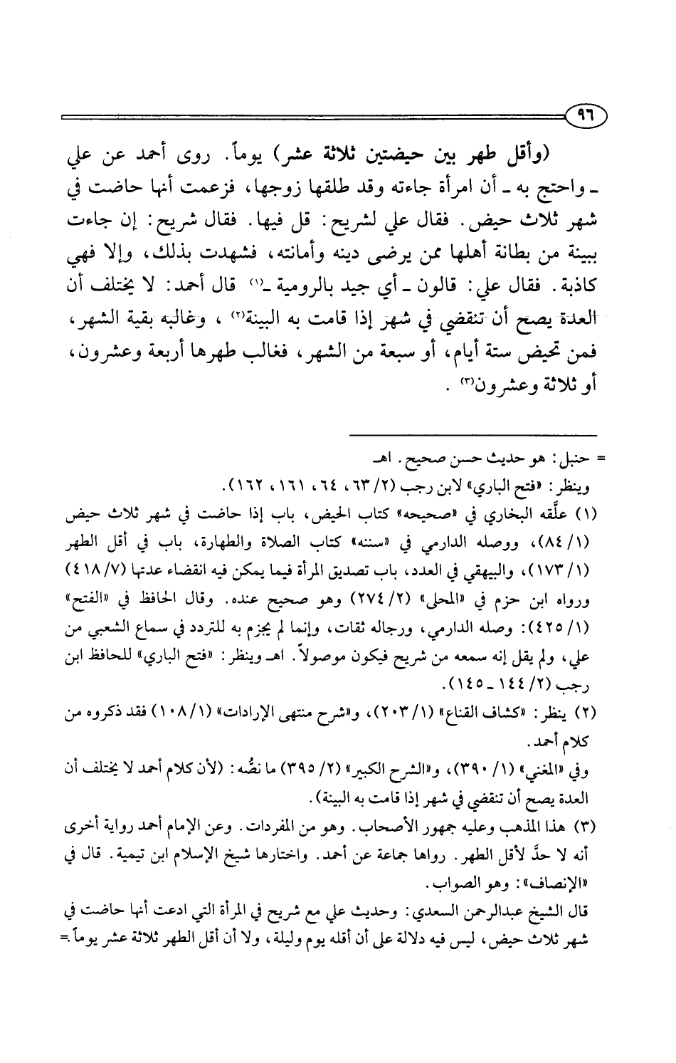 (¬1) علَّقه البخاري في "صحيحه" كتاب الحيض، باب إذا حاضت في شهر ثلاث حيض (1/ 84)، ووصله الدارمي في "سننه" كتاب الصلاة والطهارة، باب في أقل الطهر (1/ 137)، والبيهقي في العدد، باب تصديق المرأة فيما يمكن فيه انقضاء عدتها (7/ 418) ورواه ابن حزم في "المحلى" (2/ 274) وهو صحيح عنده. وقال الحافظ في "الفتح" (1/ 425): وصله الدارمي، ورجاله ثقات، وإنما لم يجزم به للتردد في سماع الشعبي من علي، ولم يقل إنه سمعه من شريح فيكون موصولًا. اهـ وينظر: "فتح الباري" للحافظ ابن رجب (2/ 144 - 145).