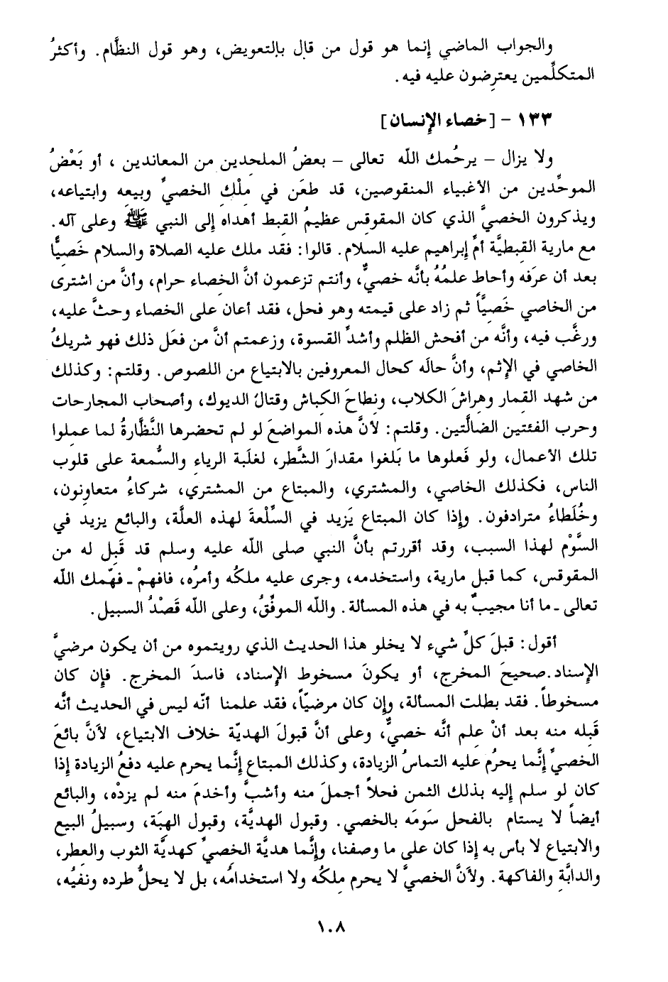 أقول: قبل كلّ شيء لا يخلو هذا الحديث الذي رويتموه من أن يكون مرضيّ الإسناد. صحيح المخرج، أو يكون مسخوط الإسناد، فاسد المخرج. فإن كان مسخوطا. فقد بطلت المسألة، وإن كان مرضيّا، فقد علمنا أنّه ليس في الحديث أنّه قبله منه بعد أن علم أنّه خصيّ، وعلى أنّ قبول الهديّة خلاف الابتياع، لأنّ بائع الخصيّ إنّما يحرم عليه التماس الزيادة، وكذلك المبتاع إنّما يحرم عليه دفع الزيادة إذا كان لو سلم إليه بذلك الثمن فحلا أجمل منه وأشبّ وأخدم منه لم يزده، والبائع أيضا لا يستام بالفحل سومه بالخصي. وقبول الهديّة، وقبول الهبة، وسبيل البيع والابتياع لا بأس به إذا كان على ما وصفنا، وإنّما هديّة الخصيّ كهديّة الثوب والعطر، والدابّة والفاكهة. ولأنّ الخصيّ لا يحرم ملكه ولا استخدامه، بل لا يحلّ طرده ونفيه،