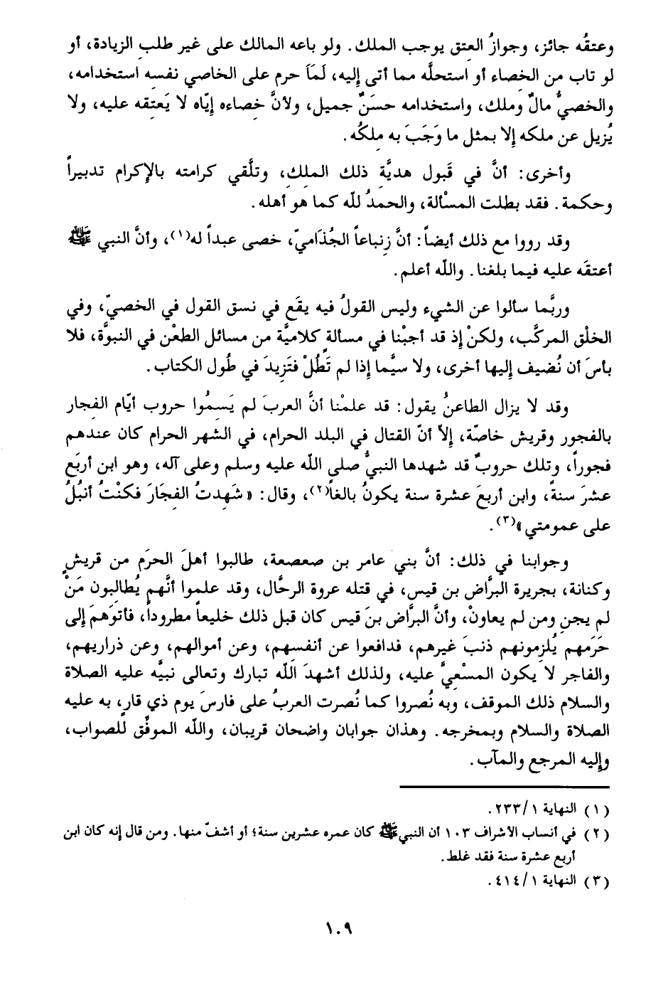 وقد لا يزال الطاعن يقول: قد علمنا أنّ العرب لم يسموا حروب أيّام الفجار بالفجور وقريش خاصّة، إلّا أنّ القتال في البلد الحرام، في الشهر الحرام كان عندهم فجورا، وتلك حروب قد شهدها النبيّ صلى الله عليه وسلم وعلى آله، وهو ابن أربع عشر سنة، وابن أربع عشرة سنة يكون بالغا «2» ، وقال: «شهدت الفجار فكنت أنبل على عمومتي» «3» .