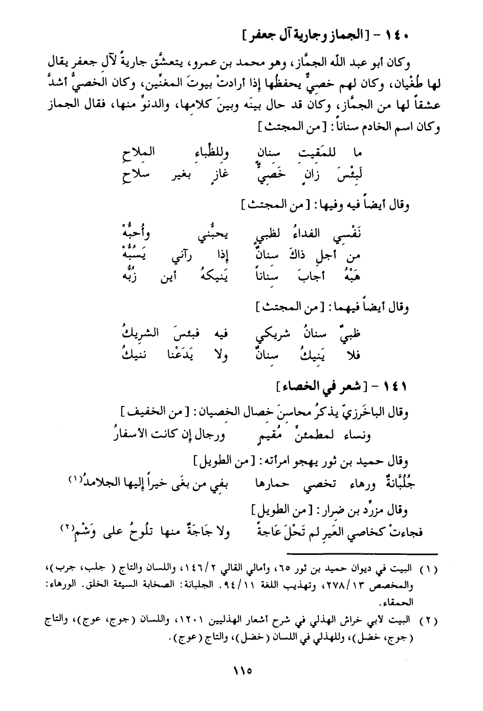 وكان أبو عبد الله الجمّاز، وهو محمد بن عمرو، يتعشّق جارية لآل جعفر يقال لها طغيان، وكان لهم خصيّ يحفظها إذا أرادت بيوت المغنّين، وكان الخصيّ أشدّ عشقا لها من الجمّاز، وكان قد حال بينه وبين كلامها، والدنوّ منها، فقال الجماز وكان اسم الخادم سنانا: [من المجتث]