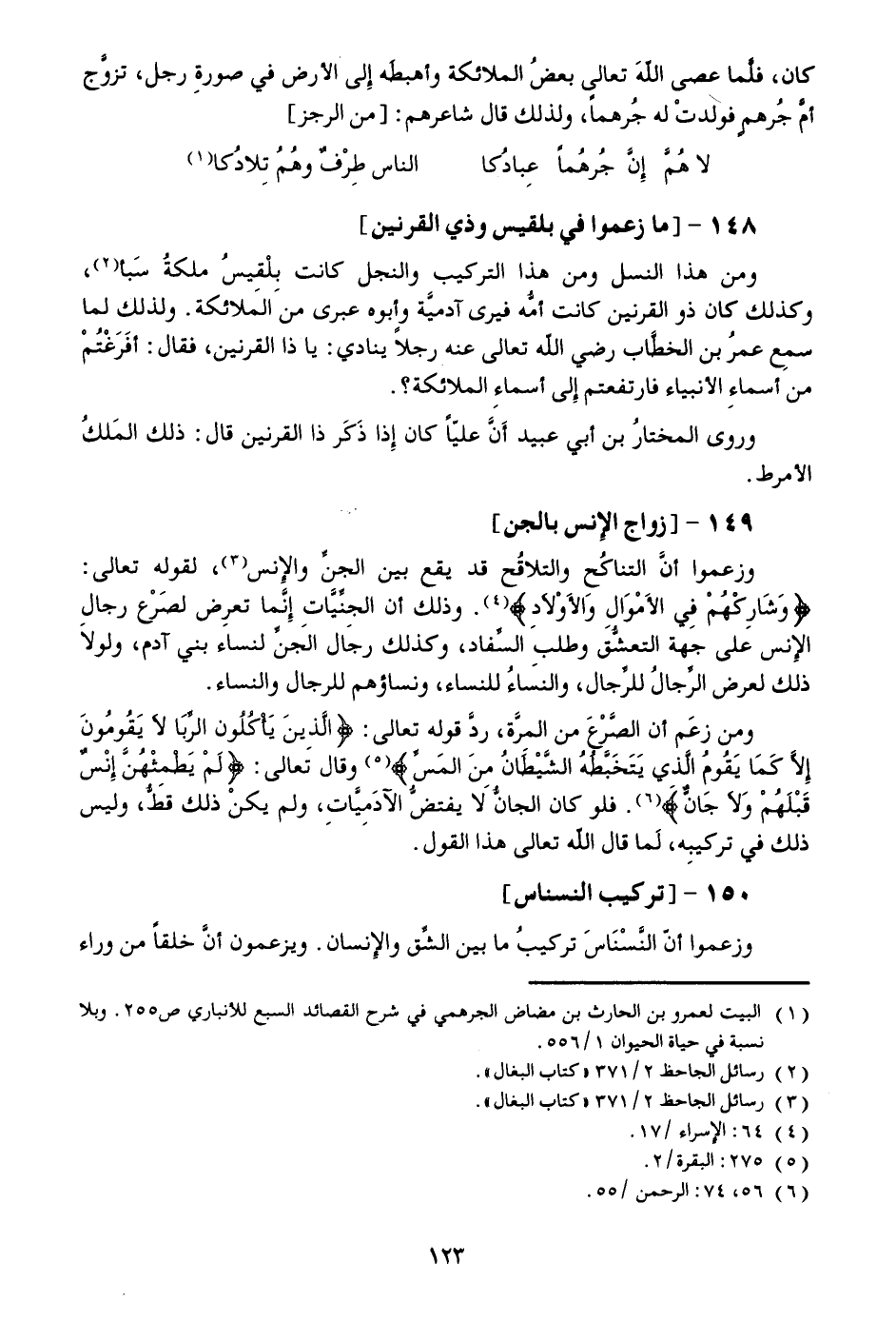 ومن هذا النسل ومن هذا التركيب والنجل كانت بلقيس ملكة سبأ «2» ، وكذلك كان ذو القرنين كانت أمّه فيرى آدميّة وأبوه عبرى من الملائكة. ولذلك لما سمع عمر بن الخطّاب رضي الله تعالى عنه رجلا ينادي: يا ذا القرنين، فقال: أفرغتم من أسماء الأنبياء فارتفعتم إلى أسماء الملائكة؟.