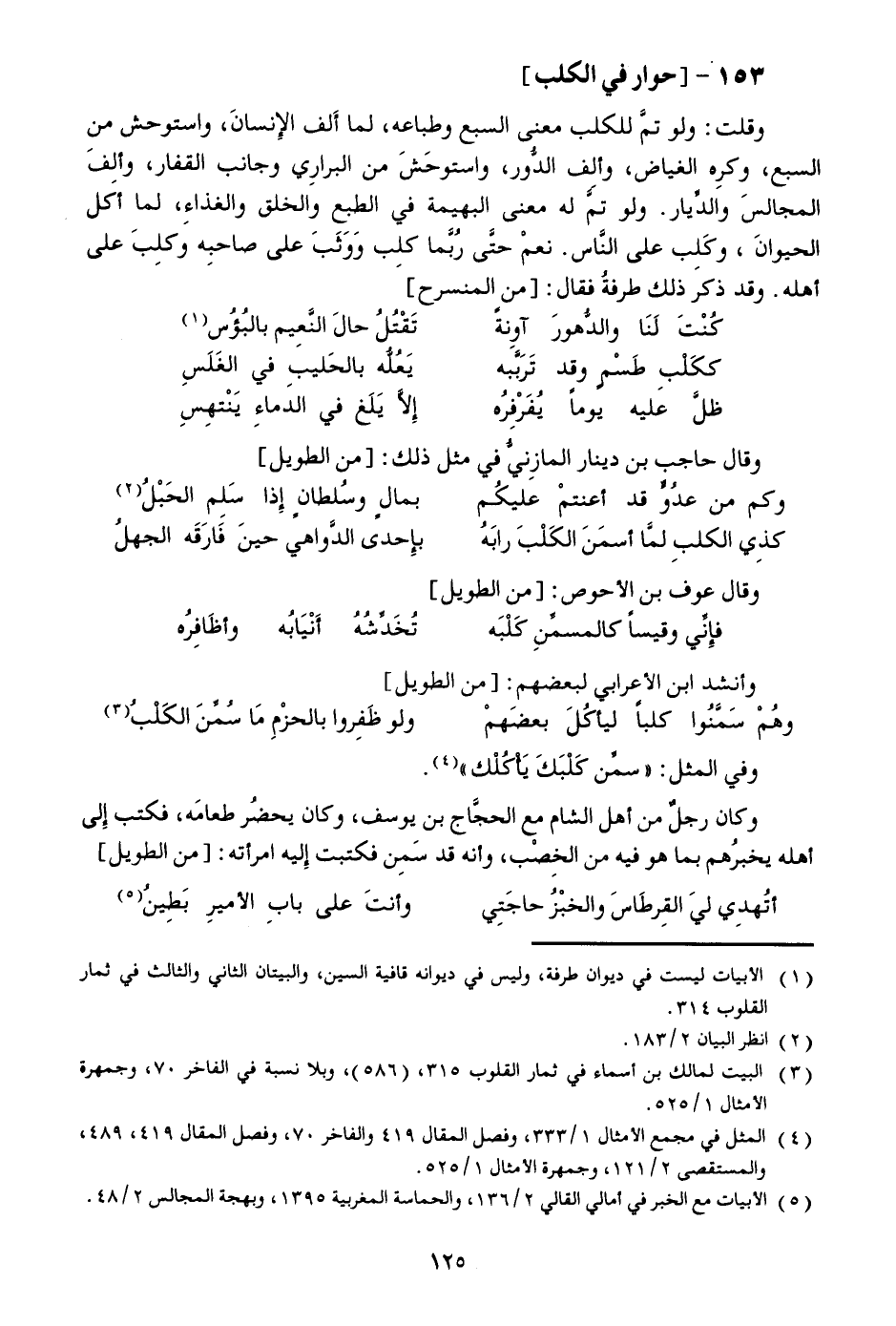 وقلت: ولو تمّ للكلب معنى السبع وطباعه، لما ألف الإنسان، واستوحش من السبع، وكره الغياض، وألف الدّور، واستوحش من البراري وجانب القفار، وألف المجالس والدّيار. ولو تمّ له معنى البهيمة في الطبع والخلق والغذاء، لما أكل الحيوان، وكلب على النّاس. نعم حتّى ربّما كلب ووثب على صاحبه وكلب على أهله. وقد ذكر ذلك طرفة فقال: [من المنسرح]