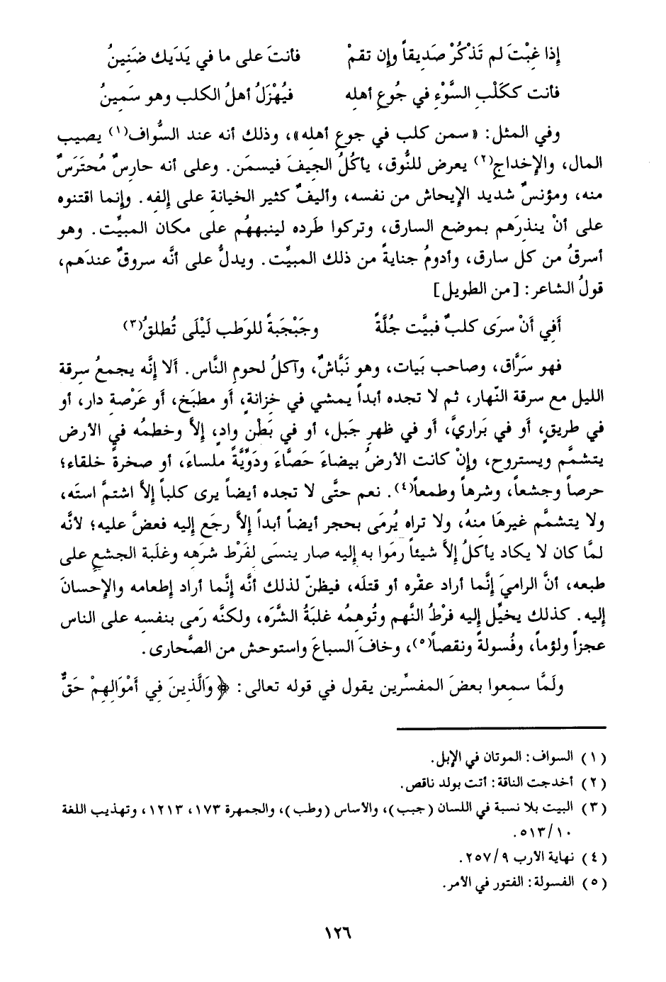 وفي المثل: «سمن كلب في جوع أهله» ، وذلك أنه عند السّواف «1» يصيب المال، والإخداج «2» يعرض للنّوق، يأكل الجيف فيسمن. وعلى أنه حارس محترس منه، ومؤنس شديد الإيحاش من نفسه، وأليف كثير الخيانة على إلفه. وإنما اقتنوه على أن ينذرهم بموضع السارق، وتركوا طرده لينبههم على مكان المبيّت. وهو أسرق من كل سارق، وأدوم جناية من ذلك المبيّت. ويدلّ على أنّه سروق عندهم، قول الشاعر: [من الطويل]