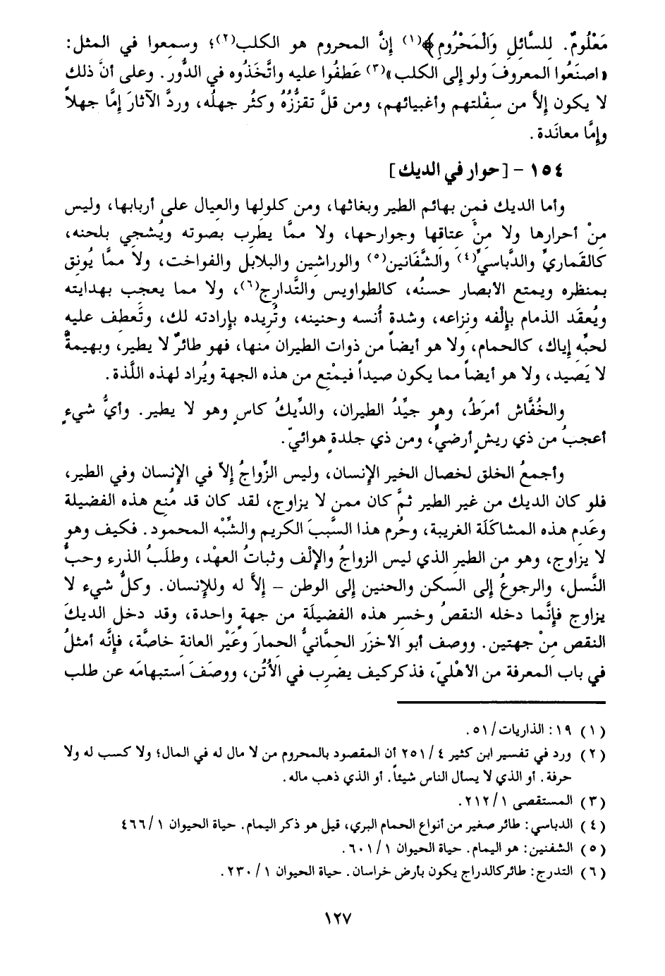 وأما الديك فمن بهائم الطير وبغاثها، ومن كلولها والعيال على أربابها، وليس من أحرارها ولا من عتاقها وجوارحها، ولا ممّا يطرب بصوته ويشجي بلحنه، كالقماريّ والدّباسيّ «4» والشّفانين «5» والوراشين والبلابل والفواخت، ولا ممّا يونق بمنظره ويمتع الأبصار حسنه، كالطواويس والتّدارج «6» ، ولا مما يعجب بهدايته ويعقد الذمام بإلفه ونزاعه، وشدة أنسه وحنينه، وتريده بإرادته لك، وتعطف عليه لحبّه إياك، كالحمام، ولا هو أيضا من ذوات الطيران منها، فهو طائر لا يطير، وبهيمة لا يصيد، ولا هو أيضا مما يكون صيدا فيمتع من هذه الجهة ويراد لهذه اللّذة.