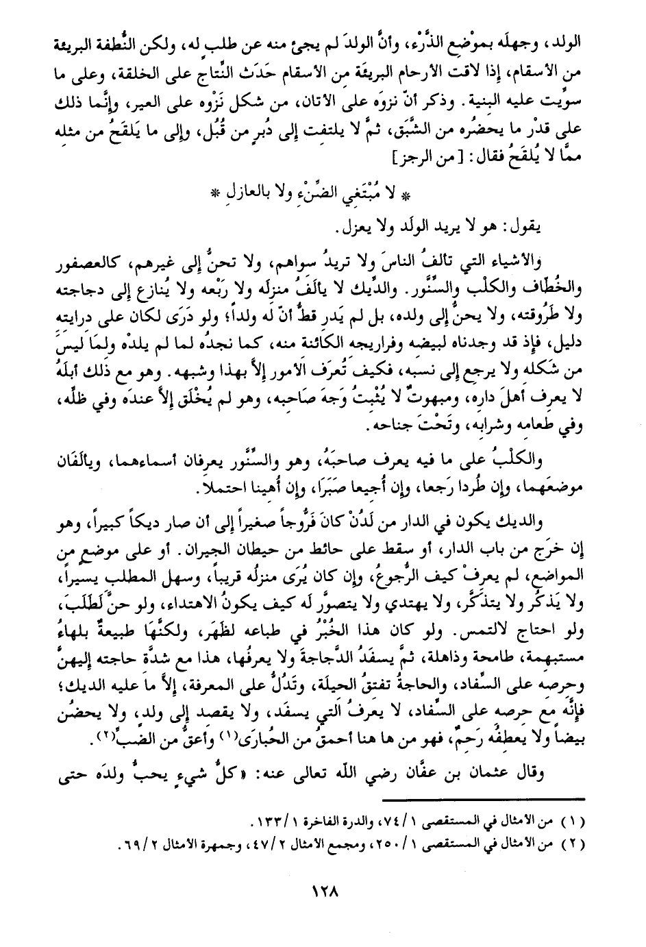 الولد، وجهله بموضع الذّرء، وأنّ الولد لم يجئ منه عن طلب له، ولكن النّطفة البريئة من الأسقام، إذا لاقت الأرحام البريئة من الأسقام حدث النّتاج على الخلقة، وعلى ما سوّيت عليه البنية. وذكر أنّ نزوه على الأتان، من شكل نزوه على العير، وإنّما ذلك على قدر ما يحضره من الشّبق، ثمّ لا يلتفت إلى دبر من قبل، وإلى ما يلقح من مثله ممّا لا يلقح فقال: [من الرجز]