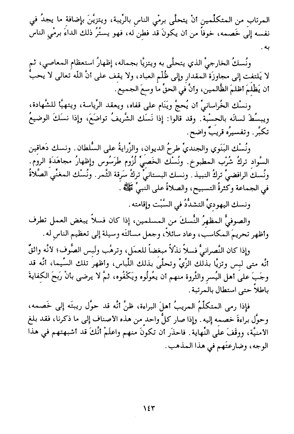 ونسك الخارجيّ الذي يتحلّى به ويتزيّا بجماله، إظهار استعظام المعاصي، ثم لا يلتفت إلى مجاوزة المقدار وإلى ظلم العباد، ولا يقف على أنّ الله تعالى لا يحبّ أن يظلم أظلم الظّالمين، وأنّ في الحقّ ما وسع الجميع.